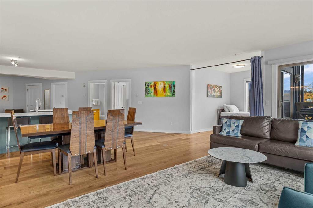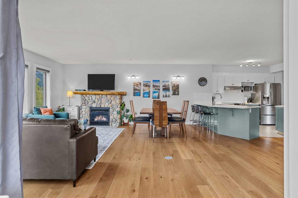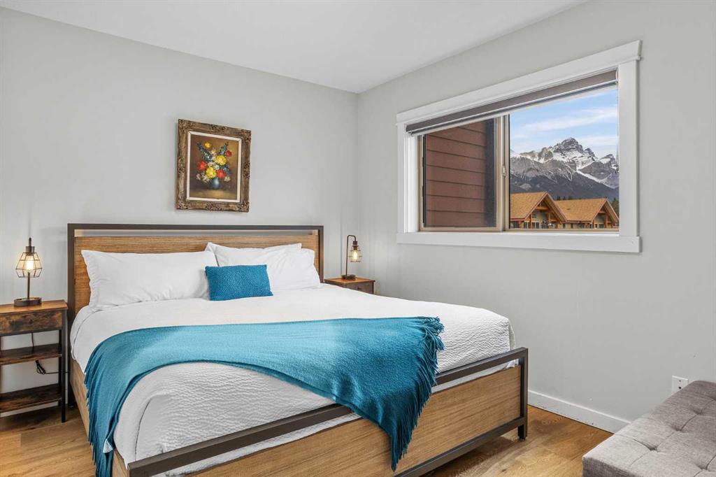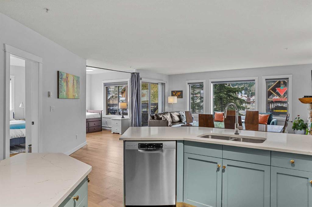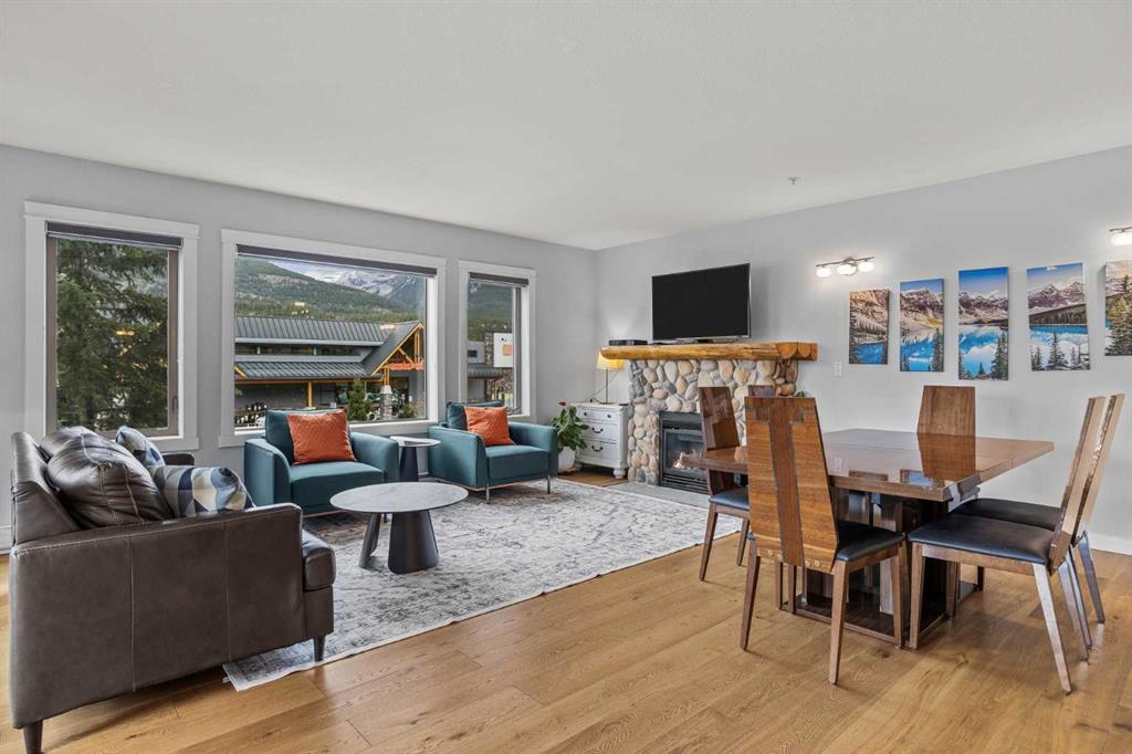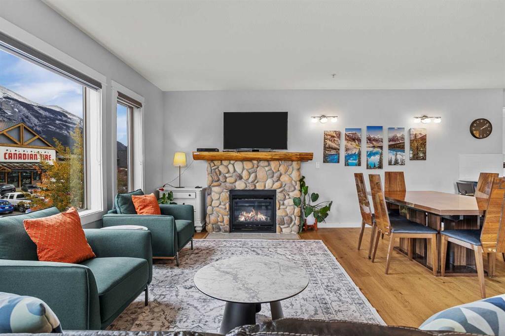 Wrap-around mountain views, rooftop hot tub, and legal tourist zoning — a rare combination. This bright corner unit offers 1,200 square feet and the flexibility to operate as a high-performing short-term rental or a full-time or lock-and-leave Canmore home. Thoughtfully renovated and fully furnished, this property is truly turnkey and positioned perfectly for the busy summer season. Currently configured as a two-bedroom plus den, the layout comfortably sleeps six and can easily function like a three-bedroom with the addition of a pull-out sofa — a simple way to expand nightly rates and overall revenue. Granite countertops, 2 tone cabinetry, durable vinyl flooring, and modern finishes deliver a clean, updated aesthetic that performs well with guests. Located in one of Canmore’s most sought-after STR buildings, this downtown address puts shops, restaurants, and trails right at your doorstep, with downtown just a block away. Owners and guests enjoy premium amenities, including a top-floor fitness room, underground parking and a stunning rooftop hot tub with 360-degree mountain views — a true differentiator in the short-term rental market. Whether you’re focused on cash flow, flexibility, or long-term value in one of the world’s strongest STR markets, this property delivers. *List price is inclusive of GST -ask your tax expert how to defer the tax*