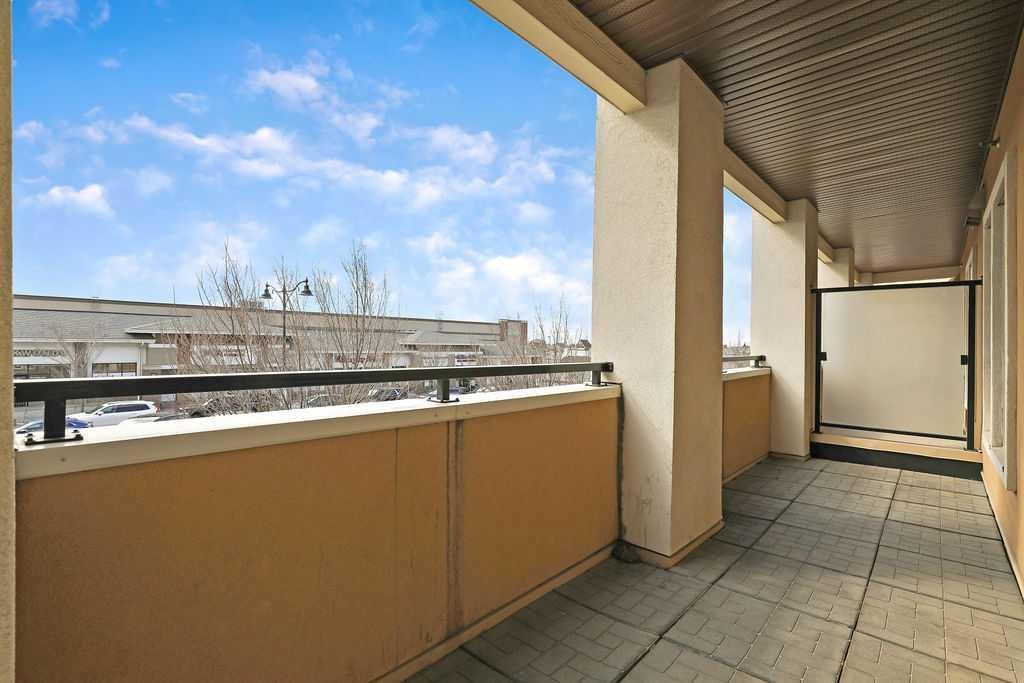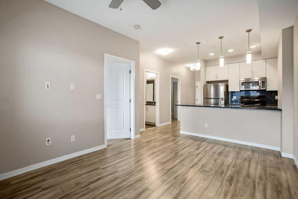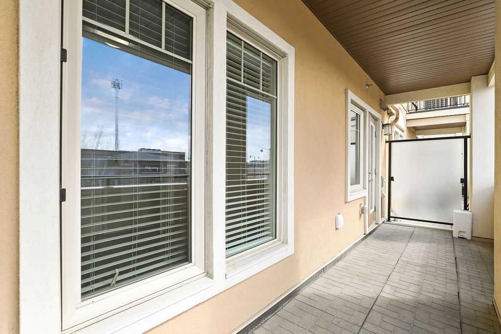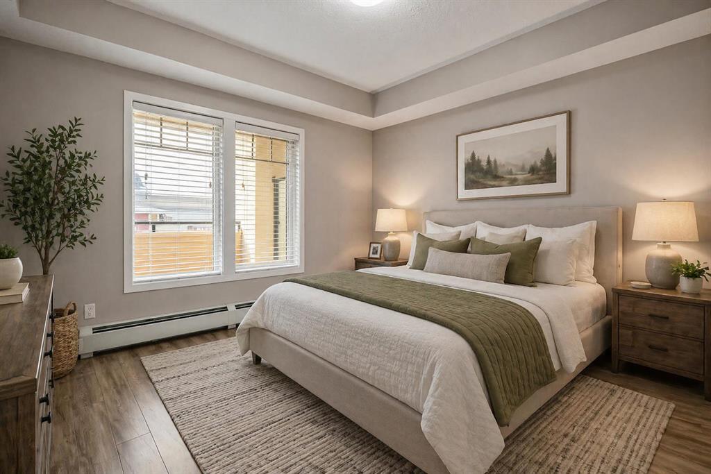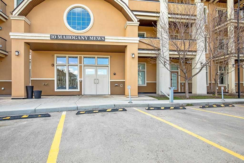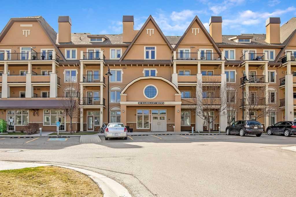 Welcome to a well maintained complex in an incredible location offering downtown charm without the congestion. Enjoy the convenience of walking to restaurants, grocery stores, pubs, coffee shops and the beautiful Mahogany Lake. Your parking stall is ideally positioned right at the front door, making daily living effortless as you come and go. The building is thoughtfully designed with amenities that truly enhance your day to day living. Two guest suites provide comfortable space for visiting friends and family, while the fitness room makes it easy to stay active. A charming library offers a quiet place to relax or read. In addition to the generous in suite storage, there is also a separate exterior storage locker for your seasonal items. Inside the home you will immediately appreciate the bright and welcoming atmosphere. The west facing exposure allows natural light to pour in through the large windows, creating a warm and inviting space throughout the day. The layout is functional and well planned, offering both comfort and flexibility. The second bedroom or den is positioned at the front of the unit, providing excellent separation from the primary bedroom. This is ideal for guests, a roommate or a private home office. The kitchen is both stylish and practical with granite countertops, a breakfast bar and plenty of cabinet and counter space for everyday living and entertaining. The dining area easily accommodates a full table and chairs with additional room for bar seating at the island. The living room is spacious and will comfortably fit your sectional and large screen television, making it a perfect place to unwind or host friends. The primary bedroom is a peaceful retreat featuring large windows and direct views toward your private west facing balcony, where you can enjoy evening sun and fresh air. Air conditioning is roughed in, giving you the option to easily add it for year round comfort. This is an excellent opportunity to own in a vibrant, walkable community while enjoying the comfort and charm of a well cared for home. Photos have been virtually staged.