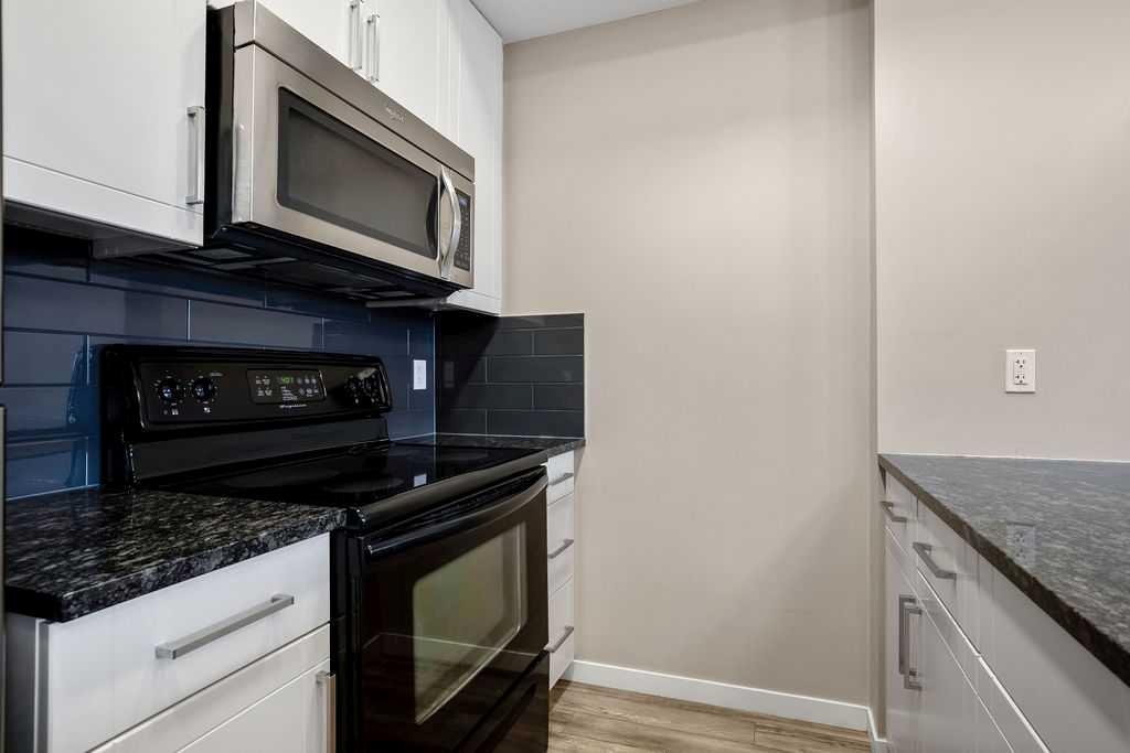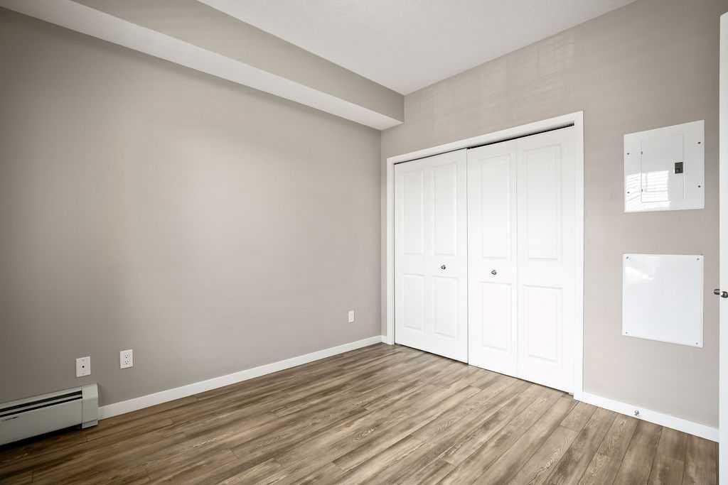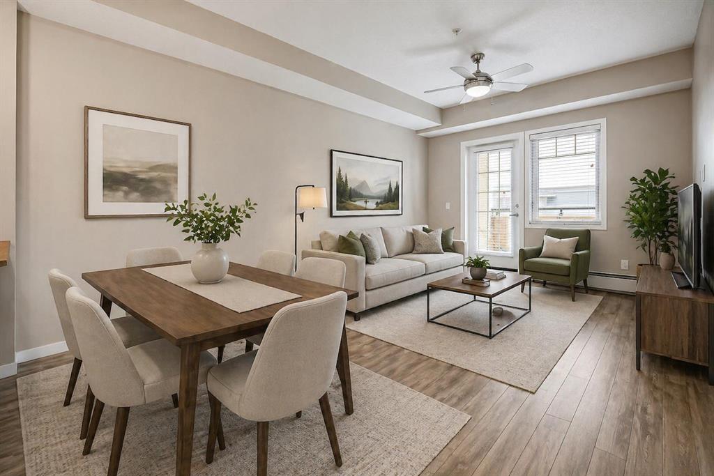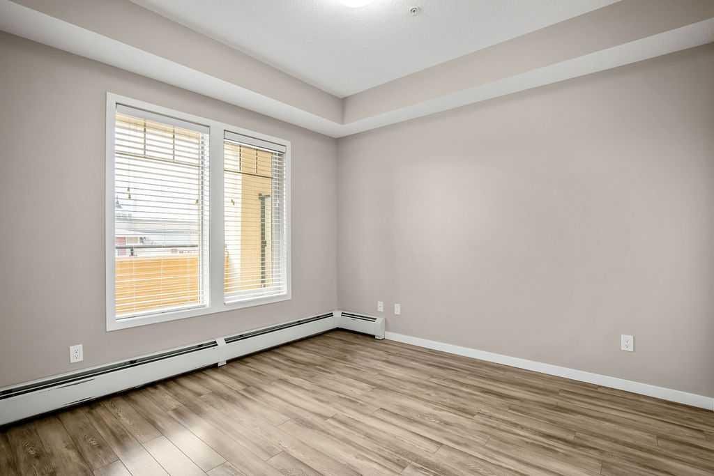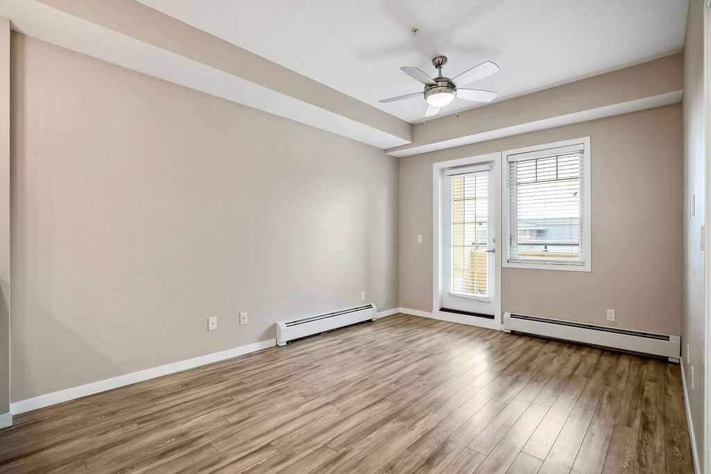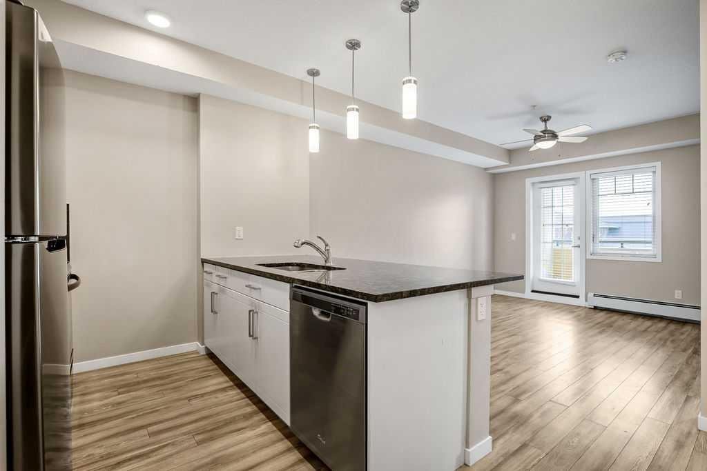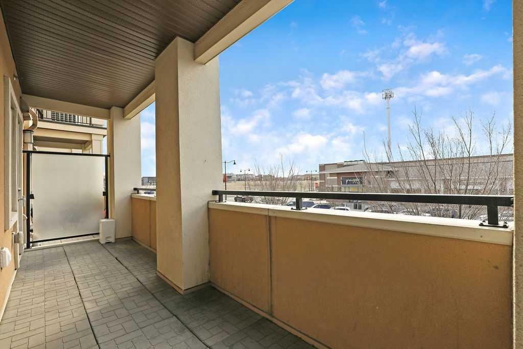 Welcome to a well maintained complex in an incredible location offering downtown charm without the congestion. Enjoy the convenience of walking to restaurants, grocery stores, pubs, coffee shops and the beautiful Mahogany Lake. Your parking stall is ideally positioned right at the front door, making daily living effortless as you come and go. The building is thoughtfully designed with amenities that truly enhance your day to day living. Two guest suites provide comfortable space for visiting friends and family, while the fitness room makes it easy to stay active. A charming library offers a quiet place to relax or read. In addition to the generous in suite storage, there is also a separate exterior storage locker for your seasonal items. Inside the home you will immediately appreciate the bright and welcoming atmosphere. The west facing exposure allows natural light to pour in through the large windows, creating a warm and inviting space throughout the day. The layout is functional and well planned, offering both comfort and flexibility. The second bedroom or den is positioned at the front of the unit, providing excellent separation from the primary bedroom. This is ideal for guests, a roommate or a private home office. The kitchen is both stylish and practical with granite countertops, a breakfast bar and plenty of cabinet and counter space for everyday living and entertaining. The dining area easily accommodates a full table and chairs with additional room for bar seating at the island. The living room is spacious and will comfortably fit your sectional and large screen television, making it a perfect place to unwind or host friends. The primary bedroom is a peaceful retreat featuring large windows and direct views toward your private west facing balcony, where you can enjoy evening sun and fresh air. Air conditioning is roughed in, giving you the option to easily add it for year round comfort. This is an excellent opportunity to own in a vibrant, walkable community while enjoying the comfort and charm of a well cared for home. Photos have been virtually staged.