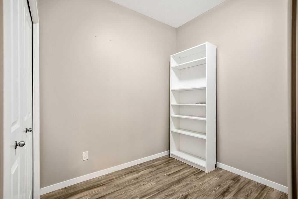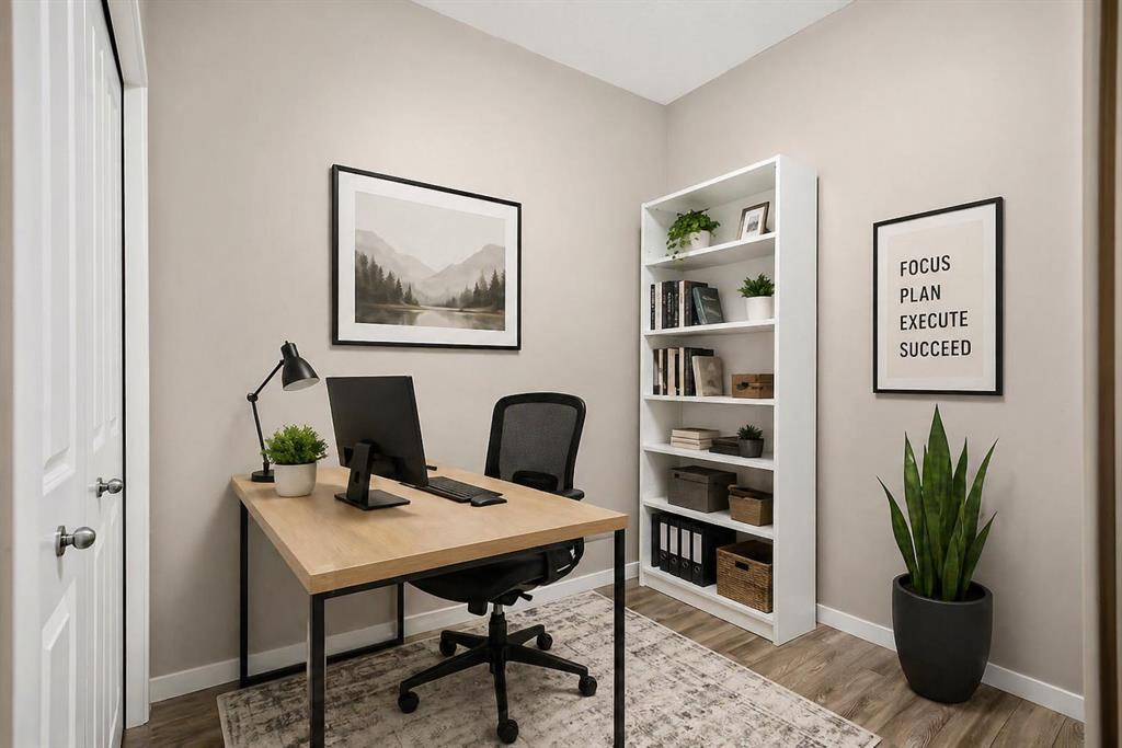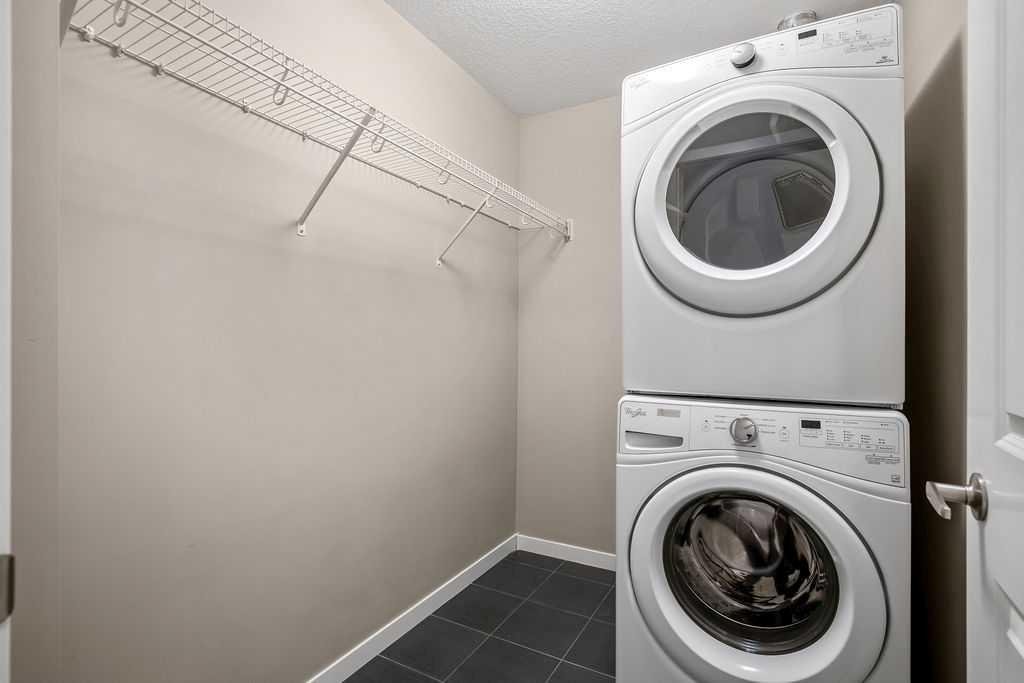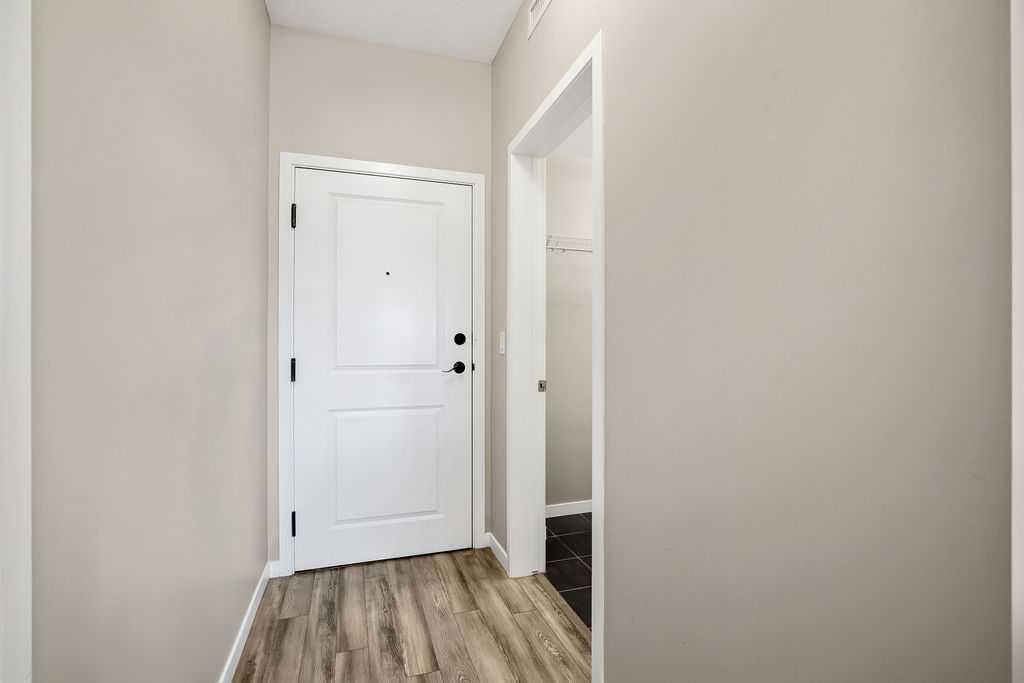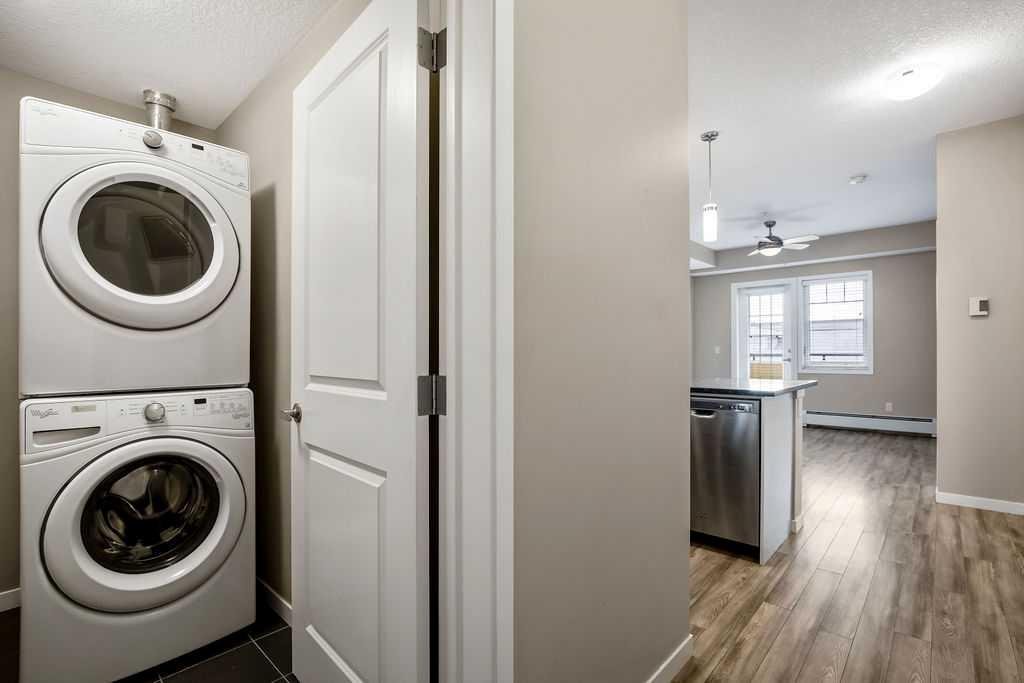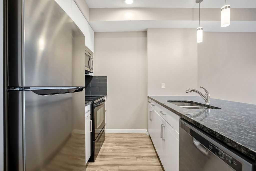 Welcome to a well maintained complex in an incredible location offering downtown charm without the congestion. Enjoy the convenience of walking to restaurants, grocery stores, pubs, coffee shops and the beautiful Mahogany Lake. Your parking stall is ideally positioned right at the front door, making daily living effortless as you come and go. The building is thoughtfully designed with amenities that truly enhance your day to day living. Two guest suites provide comfortable space for visiting friends and family, while the fitness room makes it easy to stay active. A charming library offers a quiet place to relax or read. In addition to the generous in suite storage, there is also a separate exterior storage locker for your seasonal items. Inside the home you will immediately appreciate the bright and welcoming atmosphere. The west facing exposure allows natural light to pour in through the large windows, creating a warm and inviting space throughout the day. The layout is functional and well planned, offering both comfort and flexibility. The second bedroom or den is positioned at the front of the unit, providing excellent separation from the primary bedroom. This is ideal for guests, a roommate or a private home office. The kitchen is both stylish and practical with granite countertops, a breakfast bar and plenty of cabinet and counter space for everyday living and entertaining. The dining area easily accommodates a full table and chairs with additional room for bar seating at the island. The living room is spacious and will comfortably fit your sectional and large screen television, making it a perfect place to unwind or host friends. The primary bedroom is a peaceful retreat featuring large windows and direct views toward your private west facing balcony, where you can enjoy evening sun and fresh air. Air conditioning is roughed in, giving you the option to easily add it for year round comfort. This is an excellent opportunity to own in a vibrant, walkable community while enjoying the comfort and charm of a well cared for home. Photos have been virtually staged.