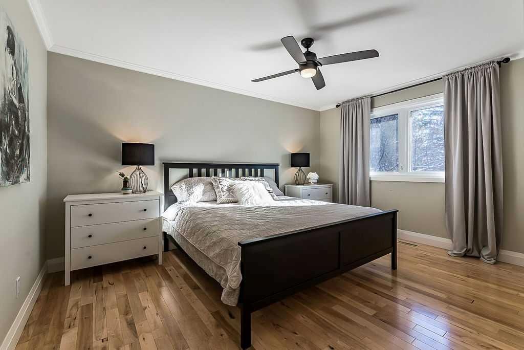 ** Open House Sat 1-3 ** AMAZING 1550SQ.FT. BUNGALOW with soaring VAULTED CEILING in beautiful Suntree, across from fountain/pond on a huge NEARLY QUARTER ACRE LOT! Numerous updates over the years, including new windows (2018), new furnace (2018), new hot water tank and water softener (2018), new shingles (2016), ensuite bathroom (2012), and kitchen & flooring (2004-2012). OPEN CONCEPT floor plan features large kitchen with maple cabinetry & island, dining room, den with large windows looking over community pond, and sunken family room with wood-burning fireplace overlooking back yard with sliding doors to patio. This level also offers primary bedroom with beautiful ensuite bathroom, two more bedrooms and large bathroom. LOWER level has a full bathroom but is otherwise unfinished with plenty of room for a fourth bedroom, rec room and storage area. Large attached double garage and a stunning HUGE south yard complete this home. If you love the charm of older neighbourhoods, want the privacy of a large lot, and seeking a bungalow with amazing sunlight & open concept plan, then you will fall in love with this one.