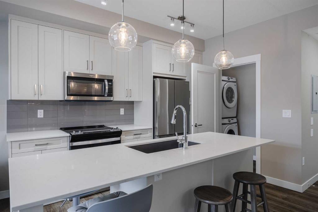 Freshly painted and in immaculate condition, this furnished 2 bedroom, 2 bathroom condo offers 757 builder square feet in a quiet location. Sold furnished, it may appeal to buyers looking for a move-in ready property or a turnkey rental opportunity. The unit features vinyl flooring throughout with no carpet, 9 foot ceilings, quartz countertops throughout, upgraded kitchen appliances, window coverings, and an HRV system for in-suite ventilation. The laundry room comes with extra storage space, and the primary bedroom offers two closets for additional storage. Quick possession is available if needed. The property includes titled underground parking with extra side clearance for easier access, along with a separate storage locker. Low condo fees add to the overall value.