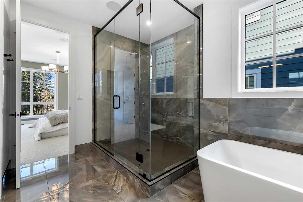Welcome to PARK SIDE OASIS DESIGNED by ANDISON RESIDENTIAL DESIGNS & BUILT BY DOMINIUM RESIDENTIAL. ! Located on one of currie’s most sought- after streets . This home boasts over 5,300 square feet of developed space and is perfect for families seeking a blend of comfort, luxury, and convenience. Discover elegance and modern living in this stunning Georgian-style residence, just 7 minutes from downtown Calgary. This exceptional home boasts a prime corner lot facing a picturesque park, offering an idyllic setting for families and professionals alike. As you approach the property, you’ll be captivated by its impressive curb appeal, enhanced by a charming courtyard and a spacious side deck, complete with a gas line for effortless barbecuing. The grand entryway welcomes you into an open-concept main floor adorned with soaring 10-foot ceilings and an abundance of natural light pouring through ample windows. Thoughtfully designed wide hallways and staircases lead you through this expansive layout, ideal for both entertaining and everyday living. The main floor features a generous home office, perfect for remote work, while the chef’s kitchen is a culinary enthusiast’s dream. Outfitted with built-in FISHER & PAYKEL appliances, including a panel-ready refrigerator and dishwasher, this kitchen also boasts a convenient POT FILLER, extensive pantry space, and elegant cabinetry, making meal preparation a delight. Ascend to the upper floor to find the luxurious primary suite, overlooking the serene park, featuring a super-sized ensuite bathroom and a spacious walk-in closet. This level also includes a large laundry area with a utility sink and ample storage solutions, along with two additional well-sized bedrooms that share a stylish Jack and Jill bathroom. The lower level is an entertainer’s paradise, showcasing a massive living room, games area, and a fully-equipped bar, complemented by a versatile flex room that can serve as a gym or media space. A fourth bedroom completes this impressive floor, making it a perfect retreat for guests. The home features a FULLY FINISHED THREE-CAR GARAGE, complete with a sleek EPOXY FLOOR and fresh paint, ensuring a polished look for your vehicles. The mechanical room is also finished with Epoxy floor, adding to the overall quality and attention to detail. Thoughtful STAIR LIGHTING enhances the beauty and functionality of the home, providing a warm glow as you navigate the HARD WOOD ON THE STAIRWAYS. Equipped with two AIR CONDITIONING units and HEATED FLOORS IN BASEMENT and primary ensuite, this home ensures year-round comfort. Innovative technology features, including Alexa voice commands for lighting and security, indoor and outdoor speakers, and a Wi-Fi irrigation system, elevate this residence to modern luxury. Not only does this home provide unrivalled amenities, but its location is equally enticing. Close to shopping, parks, and esteemed schools from preschool to senior high. Its also close to MRU