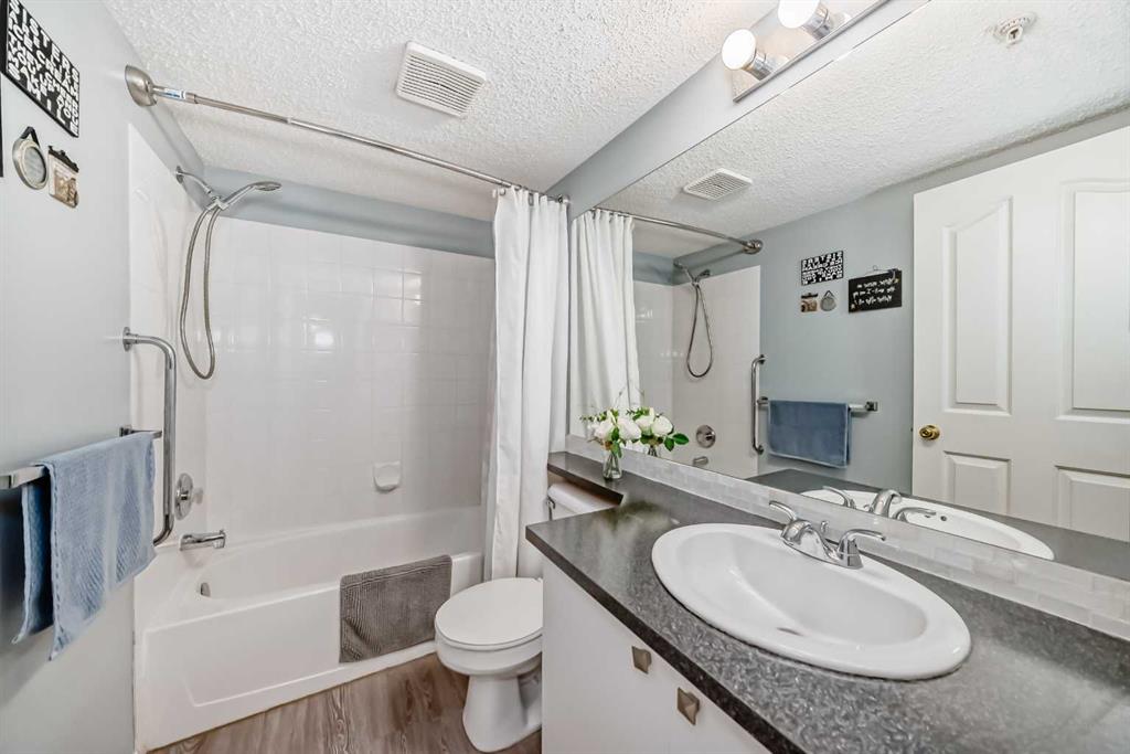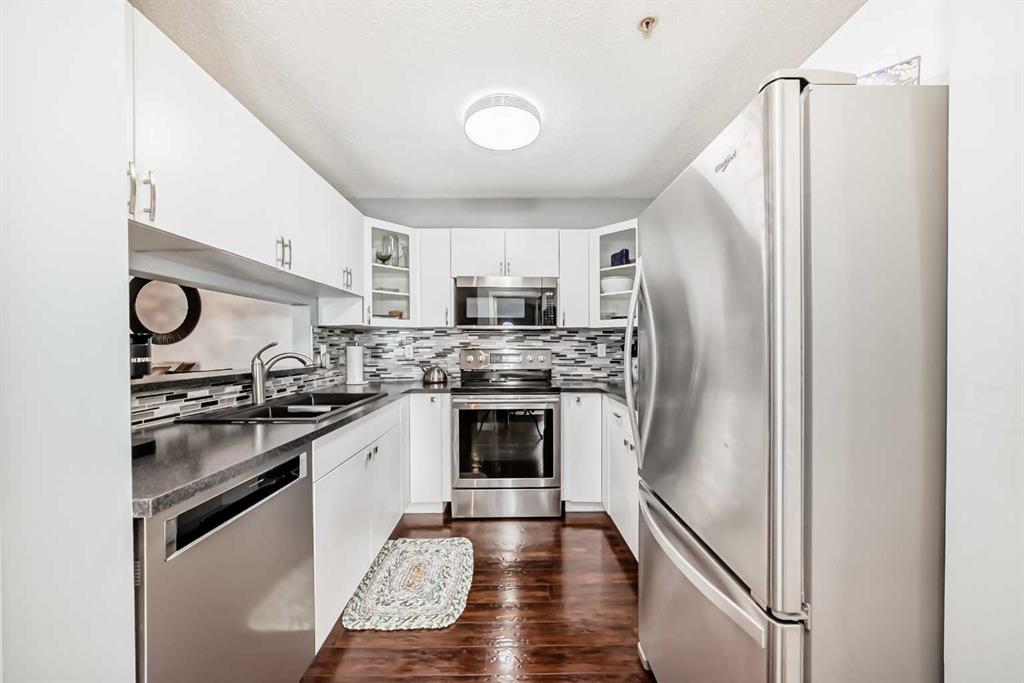 Welcome to this MOVE IN READY 2 bedroom, 2 bath, main floor unit at Tuscarora Manor backing onto GREENSPACE! Love the 1000 sq. ft. LIVING space. As you enter you’ll notice the beautiful engineered hardwood floor taking you into a Bright, Welcoming, OPEN FLOOR plan. The kitchen, with SS appliances, is a perfect size and with the breakfast bar makes it convenient for a quick meal. There is also dedicated dining for family style “sit downs.” Over the last 5 years the owner has updated most appliances. The living room is nice and bright with patio doors opening onto that greenspace out back. This gives a sense of having a yard without having to mow!…. Great area to spend with a morning coffee or evening BBQ. I hear even the moose come for a visit. Back inside the 2 bedrooms are an ample size and both face the green area. The master bedroom has a walk through closet to the 4 piece ensuite. The 2nd bedroom is perfect for guests or an office. Completing all you need is a Laundry room with Storage . Tuscarora Manor is conveniently located near the Tuscany LRT and Crowfoot Shopping District. Tuscany also has its own shopping area with Groceries, Coffee Shops and Restaurants. Stoney Trail and Crowfoot Trail make it an easy commute to work or out to the MOUNTAINS. This unit comes with 1 TITLED underground parking stall, #68, and an Assigned outside stall, #68. The building itself has a couple common areas one being the library/visiting area by the main doors and the other is a banquet room with kitchen for larger gatherings. The condo fee includes electricity which is a bonus. View this condo Today and Live here Tomorrow!