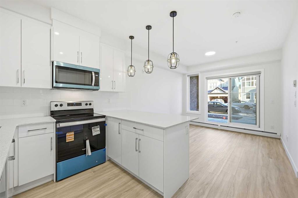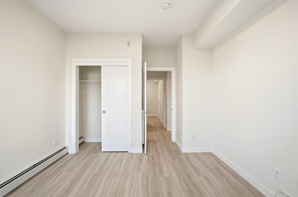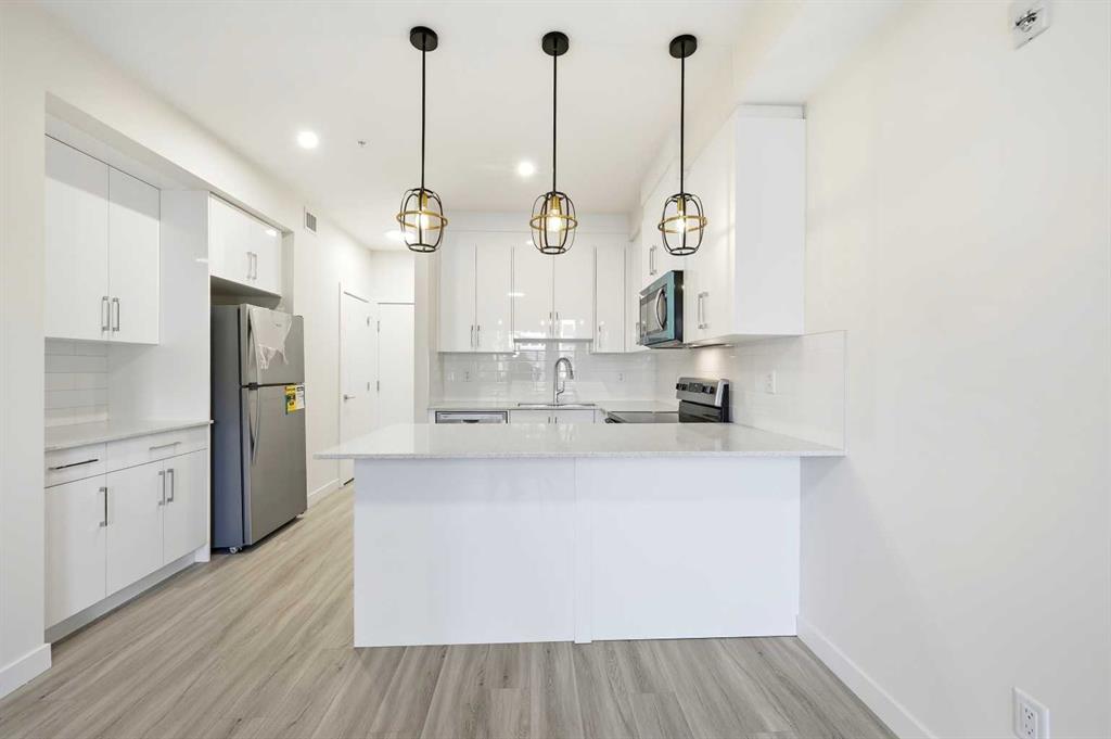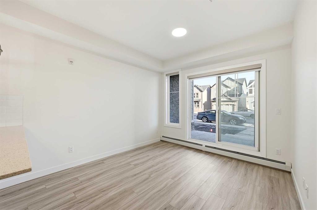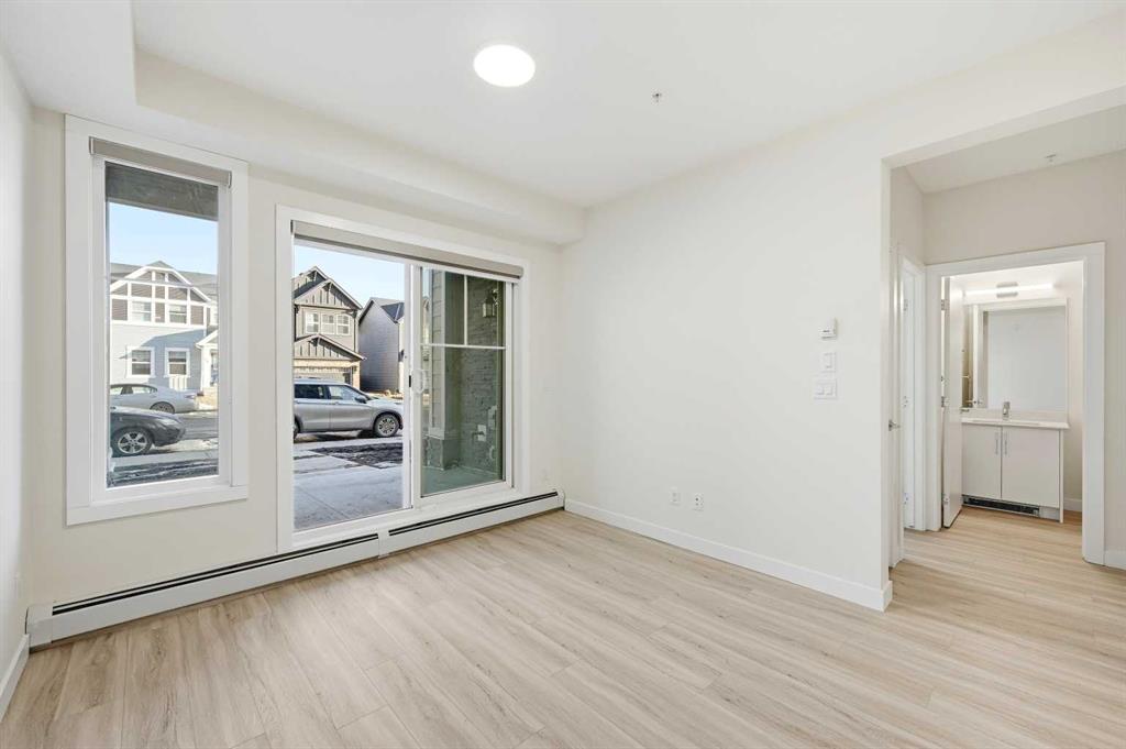 Welcome to this brand-new, move-in-ready 2-bedroom, 1-bathroom condo in the vibrant and fast-growing Skyview community of NE Calgary. Thoughtfully designed for modern living, this bright and airy home features 9-foot ceilings and expansive windows that flood the open-concept layout with natural light. Wide-plank luxury vinyl flooring and quartz countertops throughout create a sleek, contemporary finish. The fully upgraded kitchen is both stylish and highly functional, showcasing stainless steel appliances, an over-the-range microwave, soft-close cabinetry, a pantry, quartz countertops, and a convenient breakfast bar—perfect for casual dining, working from home, or entertaining. The kitchen flows seamlessly into the living and dining areas, offering a warm and inviting space to relax or host guests. This unit features two generously sized bedrooms and a modern 4-piece bathroom with quartz countertops and refined finishes. Additional highlights include in-suite laundry, upgraded designer window treatments, and a large private balcony with a BBQ gas line, ideal for summer entertaining or enjoying fresh air and open views. The home is complete with titled Underground parking, a titled storage locker, providing exceptional convenience and value. Underground Bike Racks.This Unit Located in a newly constructed building, residents enjoy low-maintenance living with easy access to shopping, schools, public transit, major amenities, Calgary International Airport, and quick connections to Stoney Trail for effortless commuting throughout the city. Perfect for first-time buyers, professionals, or investors, this turnkey condo offers an affordable opportunity to own in one of Calgary’s most desirable and rapidly growing communities. Why rent when you can own your own home and start building equity? Move in, make it yours, and enjoy the pride of ownership—this is a must-see opportunity. Please note: Property taxes have not yet been assessed.