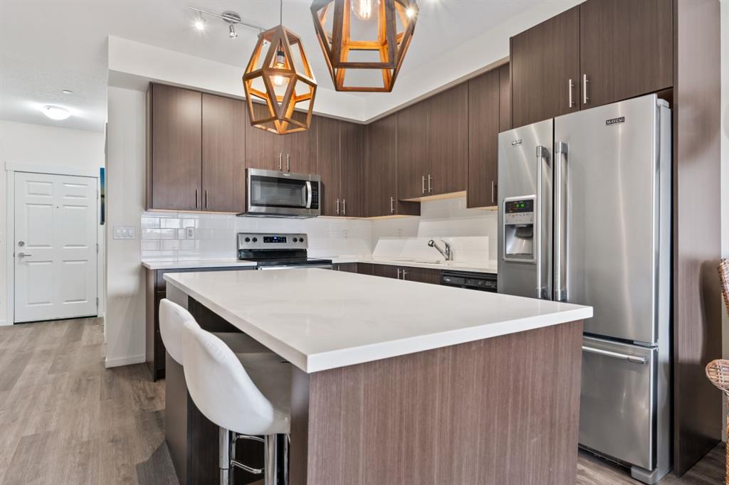 The modern kitchen features sleek quartz countertops, stainless steel appliances, and a generously sized center island, offering plenty of space for cooking and gathering. Abundant cabinet and drawer space ensures everything has its place, creating an organized and stylish cooking environment.