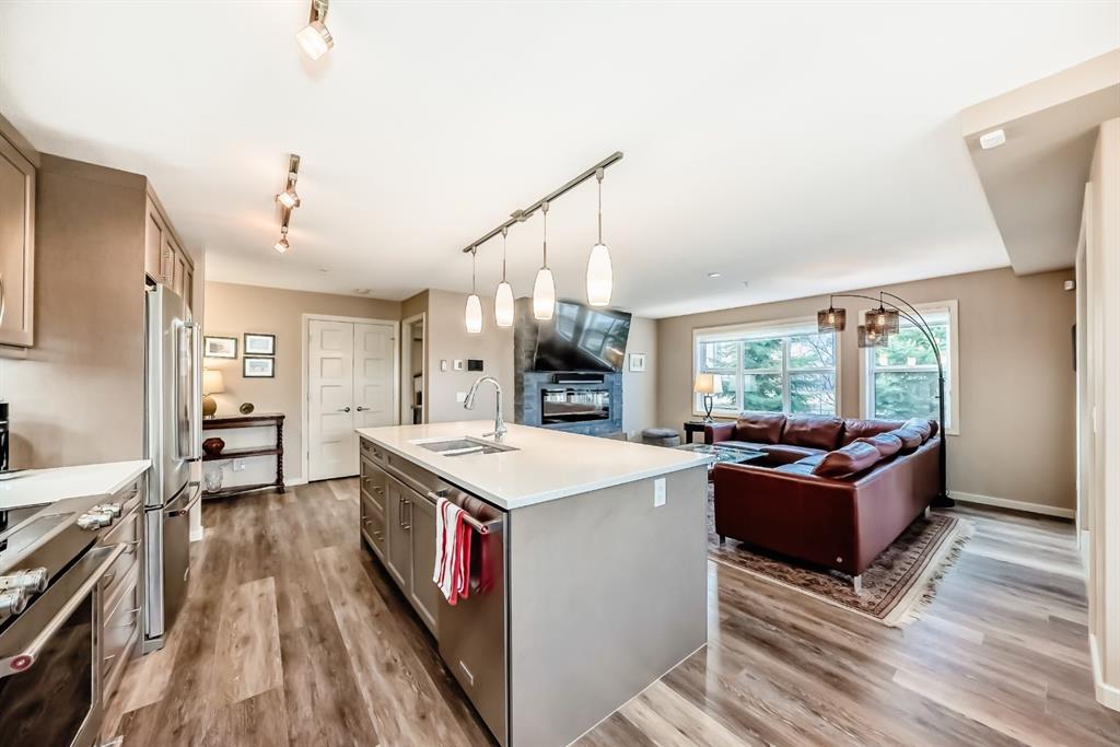 Welcome to The Chateaux at King’s Heights — Airdrie’s premier 55+ condominium, where luxury, comfort, and convenience come together. This exceptional corner suite is the LARGEST unit in the building, showcasing two spacious bedrooms, a bright den, and a sun-soaked south-facing layout designed for elegance and ease. Every detail has been elevated with the Alto Premium Upgrade Package and over $35,000 in additional enhancements, including upgraded tile and cabinetry, luxury vinyl plank flooring, a stunning floor-to-ceiling stone gas fireplace, in-floor radiant heating, air conditioning, a garburator, and a full alarm system with window and door sensors plus keypad entry on both exterior doors.