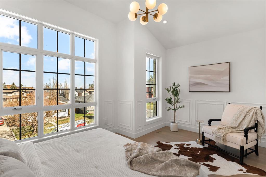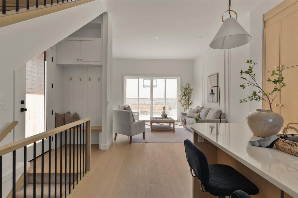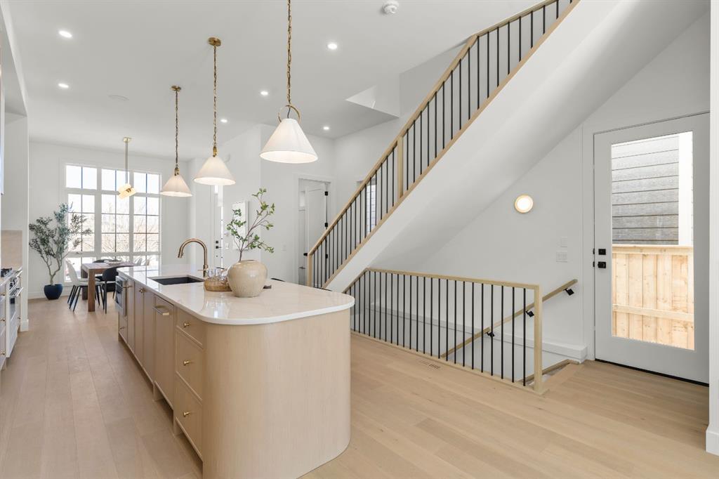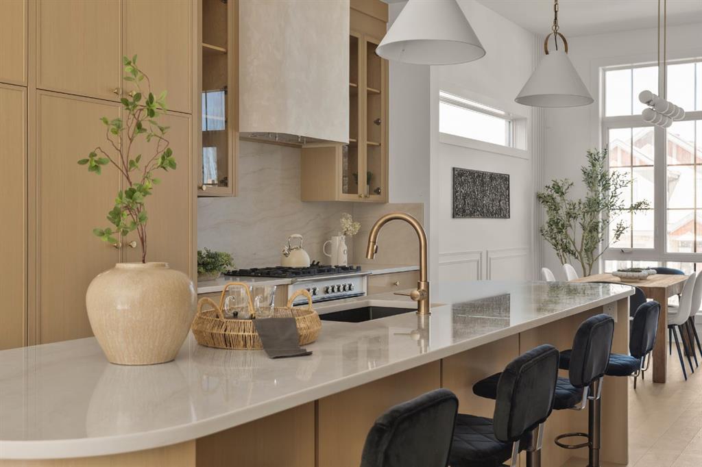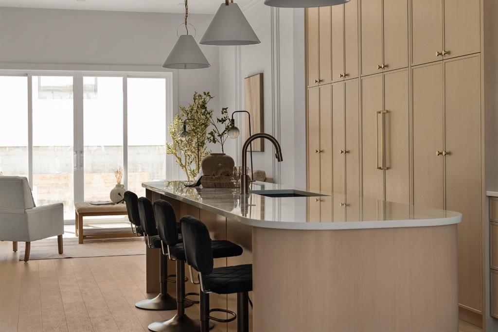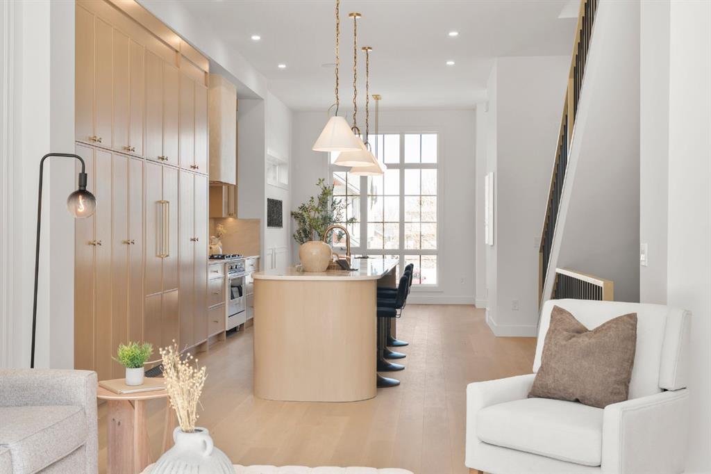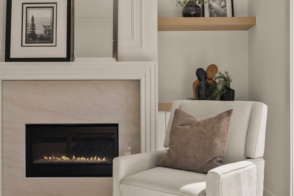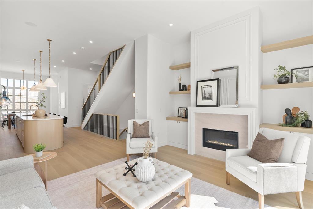 Last unit remaining. This beautifully designed residence offers over 2,400 sq ft of thoughtfully curated living space, complete with a sunny south-facing backyard that fills the home with natural light, blending refined finishes with a functional layout. A grand foyer welcomes you into the main level, featuring soaring 11-foot ceilings and rich hardwood flooring throughout, while the formal dining area is enhanced by custom wainscoting and large windows that flood the space with natural light. The designer kitchen is a true centerpiece, showcasing a curved island with Taj Mahal quartzite, premium built-in Fisher & Paykel appliances, white oak shaker cabinetry, gold and black fixtures, a curved plaster chimney hood, black granite sink, and under-cabinet lighting. The spacious great room is anchored by a custom tiered gas fireplace finished in quartz slab, complemented by built-in shelving and cabinetry, while a functional mudroom with built-ins and bench seating, along with a stylish powder room wrapped in designer wallpaper, complete the main level. Upstairs, 9-foot ceilings and hardwood floors continue through the hallways, leading to a stunning primary retreat with high ceilings, floor-to-ceiling windows, detailed wainscoting, and a luxurious 5-piece ensuite featuring in-floor heating and a steam shower rough-in, along with two additional bedrooms, one offering private access to a 3-piece bath, and a convenient upper laundry room. The fully finished basement adds versatility with a large recreation area, an additional bedroom, and a 3-piece bathroom. Ideally located close to downtown, parks, and Marda Loop, this is the final opportunity to own in this sought-after development. Contact today to book your private showing.