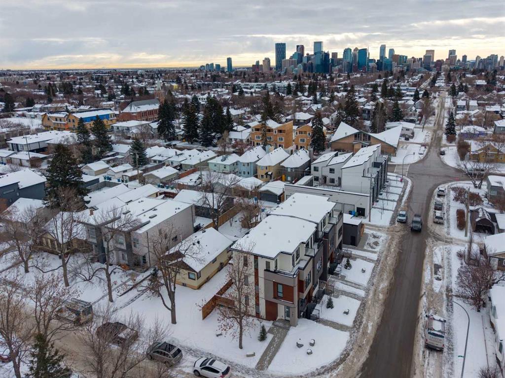 Mount Pleasant – 2122 7 Street NW: Welcome to this beautiful townhome offering 3 bedrooms, 4.5 bathrooms, a single-car garage, and over 2,100 sq ft of developed living space. Designed by respected Calgary architect John Trinh and Associates, this project showcases high-level craftsmanship, thoughtful material selection, and exceptional attention to detail throughout. The main floor features a spacious front entry, a bright living room with an electric fireplace and built-in shelving, and a central kitchen complete with stainless steel appliances, an island with seating, a pantry cupboard, and a dining area with access to the deck. A convenient two-piece powder room completes this level. The second floor offers two generously sized bedrooms, each with its own ensuite, one with a four-piece bathroom and the other with a three-piece. A well-equipped laundry room with cabinets, a sink, and a folding counter adds everyday convenience. The entire third level is dedicated to the primary retreat, featuring exclusive access to the top-floor balcony, a walk-in closet, and a luxurious five-piece ensuite with dual sinks, a soaker tub, and a walk-in shower. The lower level features a legal studio suite with a private entrance, its own full kitchen equipped with stainless steel appliances, a comfortable living area, and a four-piece bathroom. Ideally located in the heart of Mount Pleasant, one of Calgary’s most desirable mature communities, this home offers easy access to Confederation Park, SAIT, and the University of Calgary. Enjoy a quick commute to downtown along with nearby transit routes on 4 Street, Centre Street, and 20 Avenue, plus a great selection of local restaurants and coffee shops.