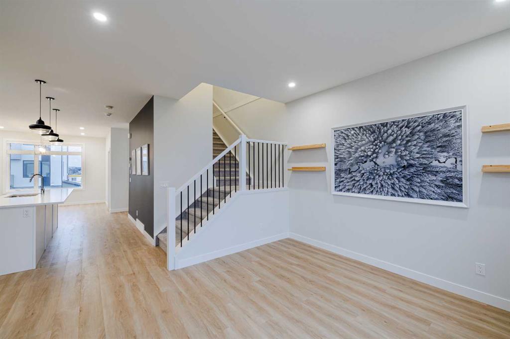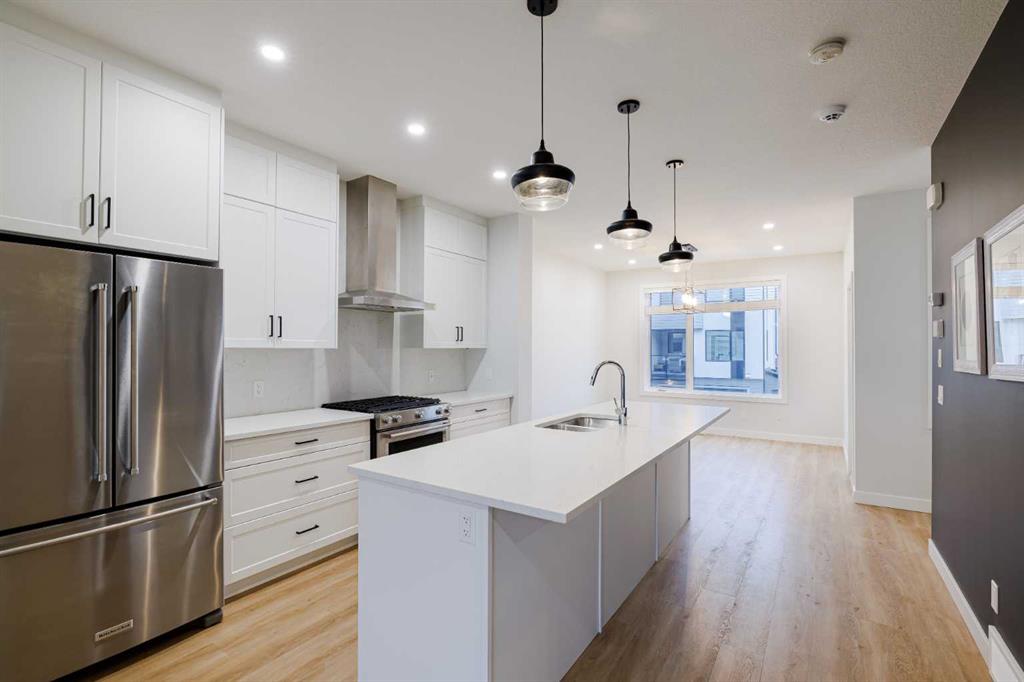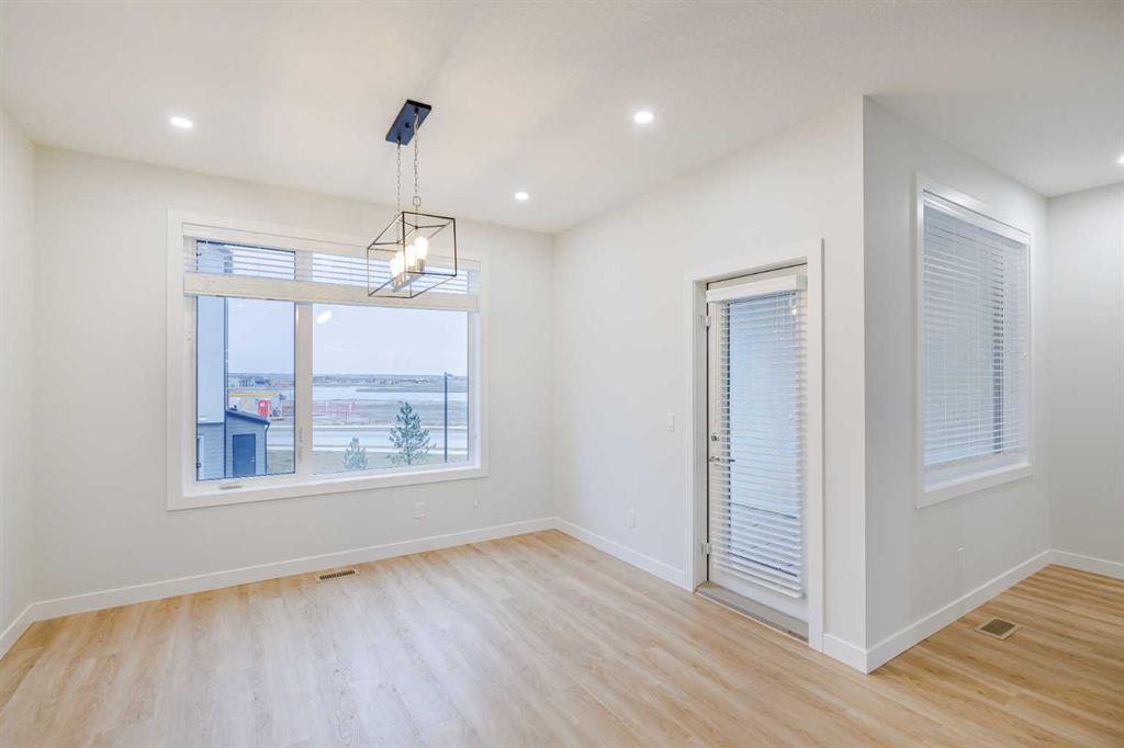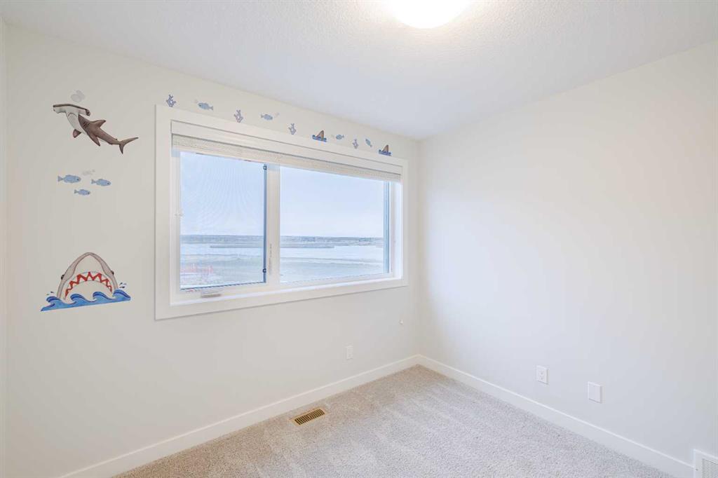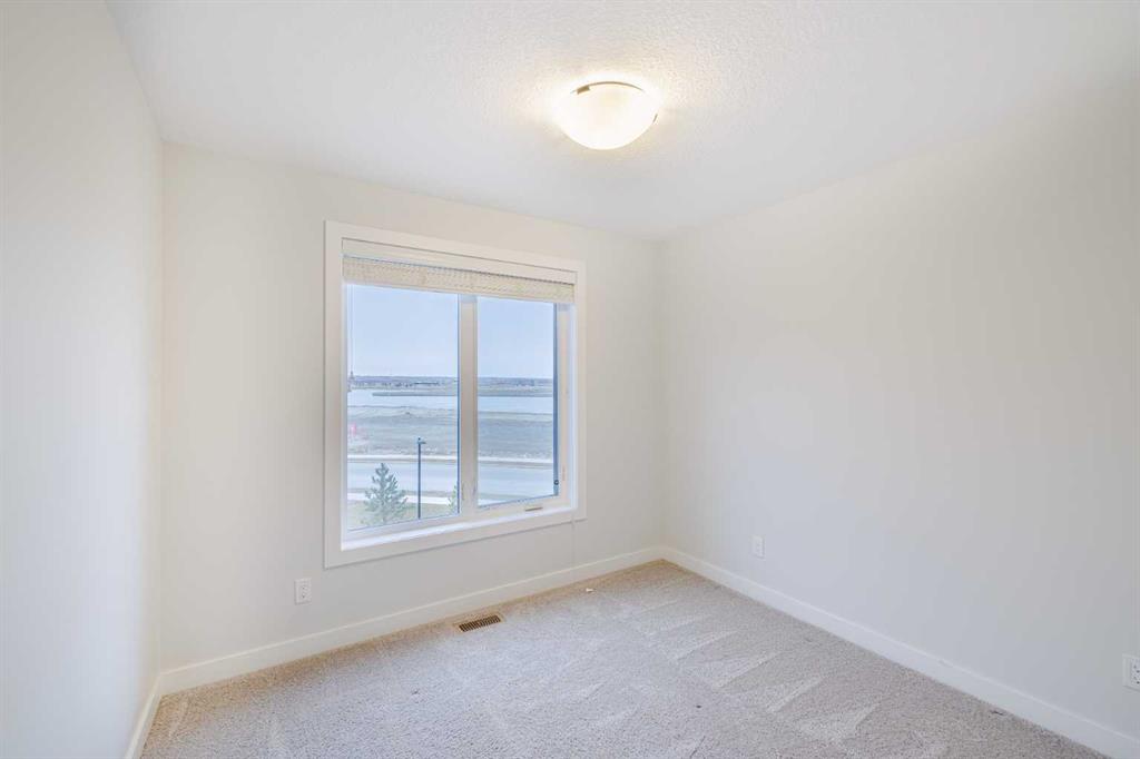 Welcome to this exquisite townhome that epitomizes the perfect blend of luxury, functionality, and natural beauty. Nestled in Harmony—an award-winning community that has proudly earned “Community of the Year – Calgary Region” eight times—this residence stands out with a plethora of upgrades, meticulous maintenance, and thoughtful design. Harmony offers an unmatched lifestyle, combining lake and golf living, walkable amenities, and stunning mountain views. As a resident, you’ll enjoy social membership at the renowned Mickelson National Golf Club, giving you access to world-class golfing right in your backyard. Families will appreciate the proximity to sought-after schools including Springbank Middle School, Springbank Community High School, and the prestigious Edge School for athletes and academics. As you step inside, you are greeted by a spacious den off the front entrance, just steps from the oversized double-car garage featuring a forward-thinking 40-amp EV connection, a true testament to modern living. Ascending to the main level, the kitchen immediately captivates with its elegant finishes—quartz countertops, a large island with breakfast bar seating, ceiling-height white cabinetry, and upgraded stainless steel appliances including a gas range for the culinary enthusiast. A massive pantry with extensive shelving ensures optimal organization. Adjacent to the kitchen is a charming eating nook with access to the front deck, where you can enjoy peaceful lake views. The sunlit living room offers a bright and inviting atmosphere, with panoramic mountain vistas framed by large windows, and a stylish fireplace with custom tile surround adding warmth and sophistication. The upper level showcases the primary suite, complete with a custom California Closet system and a spa-like ensuite featuring in-floor heating, a private water closet, standalone shower, and dual vanity. An upgraded laundry area with quartz countertop, additional shelving, and a large linen closet adds convenience. Two additional generously sized bedrooms and a 4-piece bathroom complete this floor. Outside of the home, Harmony’s amenities enrich everyday living—a 5-minute drive to Calaway Park, and the upcoming Bingham Crossing development with a future Costco and numerous shops and services. Residents also enjoy walking access to the community lake, miles of pathways, and future commercial amenities including the Nordic Spa. This townhome goes beyond ordinary, delivering a lock-and-leave lifestyle with maintenance-free living—no snow shoveling or yard work required—and four parking spots between the garage and driveway. With air conditioning, thoughtful upgrades, breathtaking surroundings, and pride of ownership throughout, this home offers not just a residence, but a lifestyle of elegance and harmony.