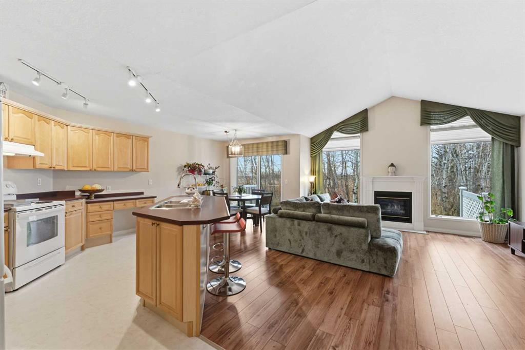 Step inside and you’ll instantly feel the airy space created by high vaulted ceilings and big sunny windows that frame a beautiful backdrop of mature trees. The open-concept layout allows the kitchen, dining, and living areas to flow together seamlessly, perfect for quiet mornings or friendly get-togethers. The kitchen island is a natural hangout spot, and the cozy gas fireplace adds warmth and charm on chilly days.