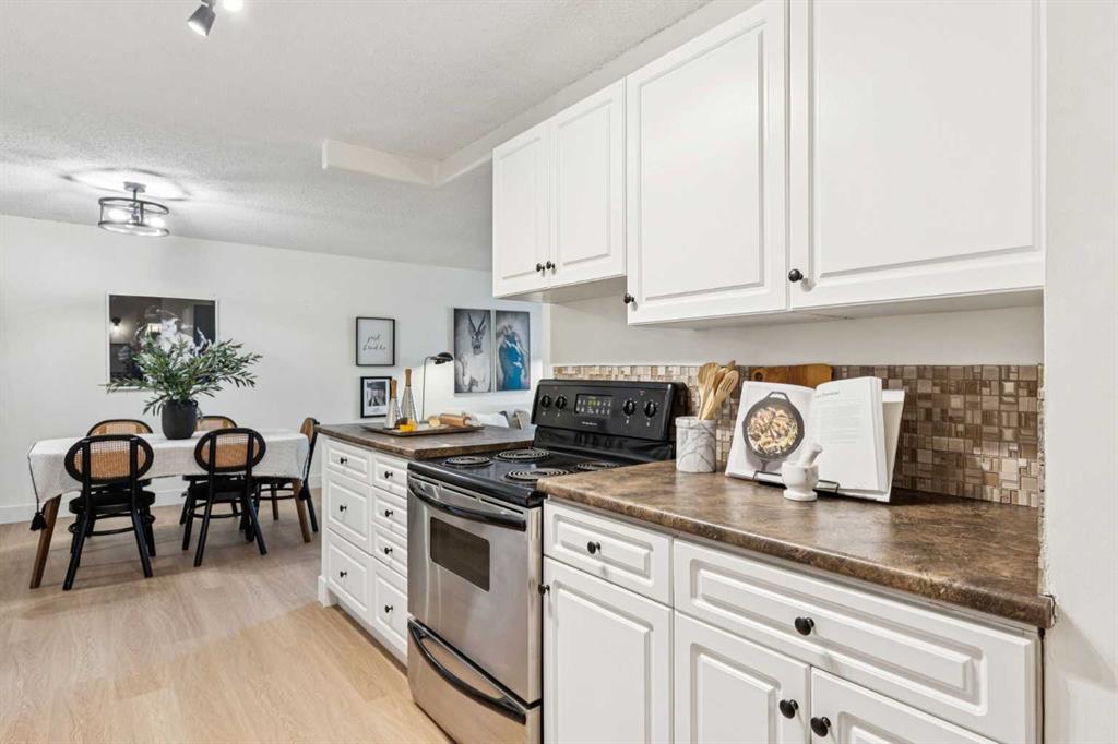 The kitchen is both functional and stylish, boasting white cabinetry with striking black hardware, stainless steel appliances, a mosaic tile backsplash, and contemporary black metal and glass light fixtures. Newly installed oak vinyl plank flooring runs seamlessly throughout the space, adding a touch of elegance.