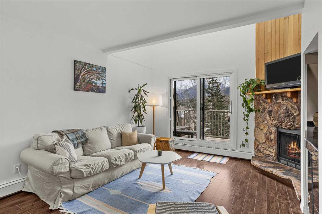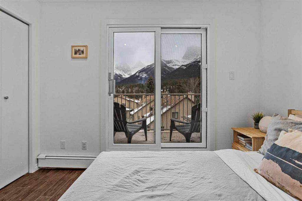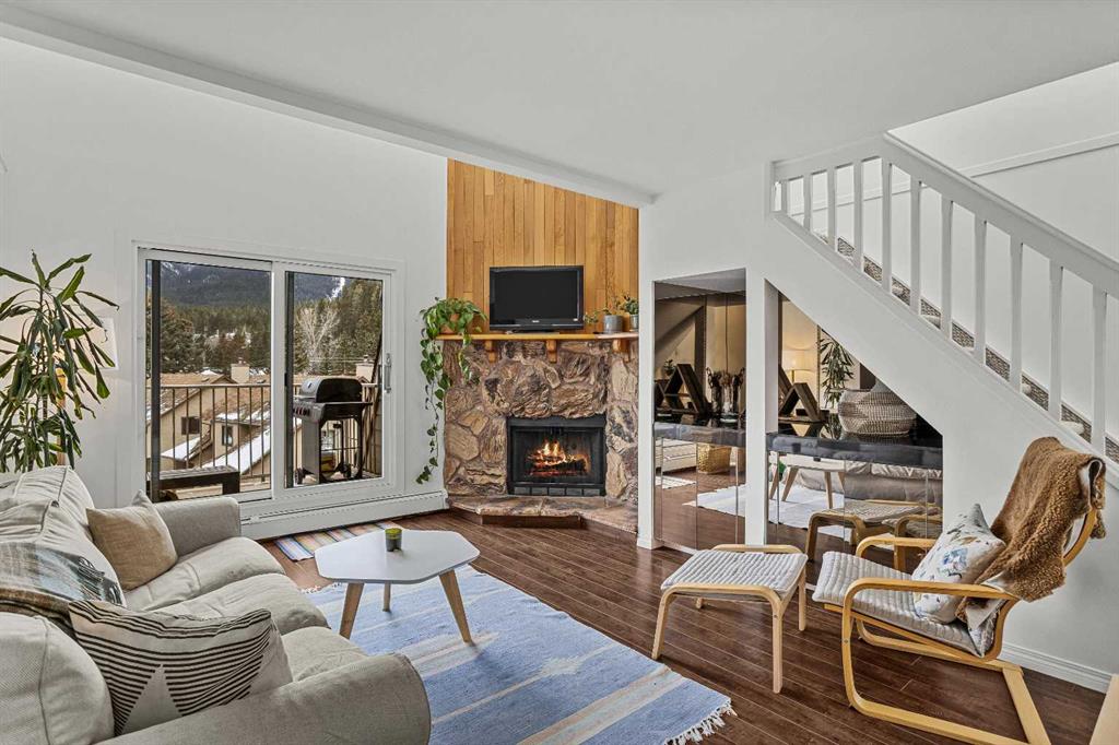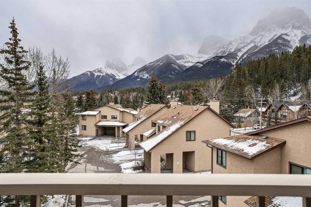 Just steps from the Bow River, endless trails & the singular mountain town aura that Canmore brings, you’ll find this top level, 2 bed & loft townhouse. On entry, the views are immediately apparent, with a direct line-of-sight to the emblematic Three Sisters mountains. Anchored by a feature fireplace, the main living area is a calming refuge, where high ceilings & natural light take advantage of the southeast aspect. Year round sun is a certainty during the many blue-sky days the valley enjoys. A private, spacious deck brings wonderful additional living space. The kitchen is a study in efficiency with an adjacent dining area ideal for a “4 top” table. The 2 bedrooms offer a south facing primary enjoying a second view deck. The second bedroom is great for guests or the growing family. What sets this home apart must be the loft; on its own level, the “hanging” design is open on two sides under a high shed roof. “Clerestory” windows above frame a broad swath of sky. A feature only found in new construction at far higher prices. Outside, a covered parking stall has a large storage area perfect for your toys & gear. New windows highlight the care & attention of the condo corporation ensuring trouble free ownership.