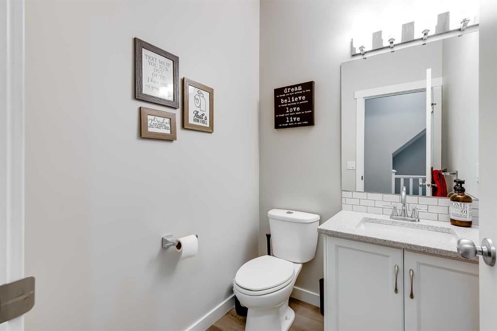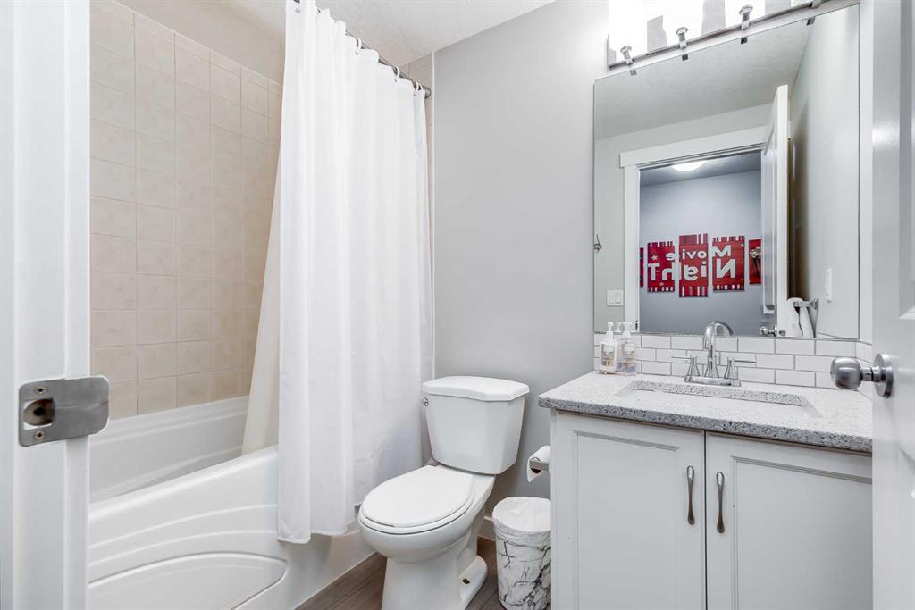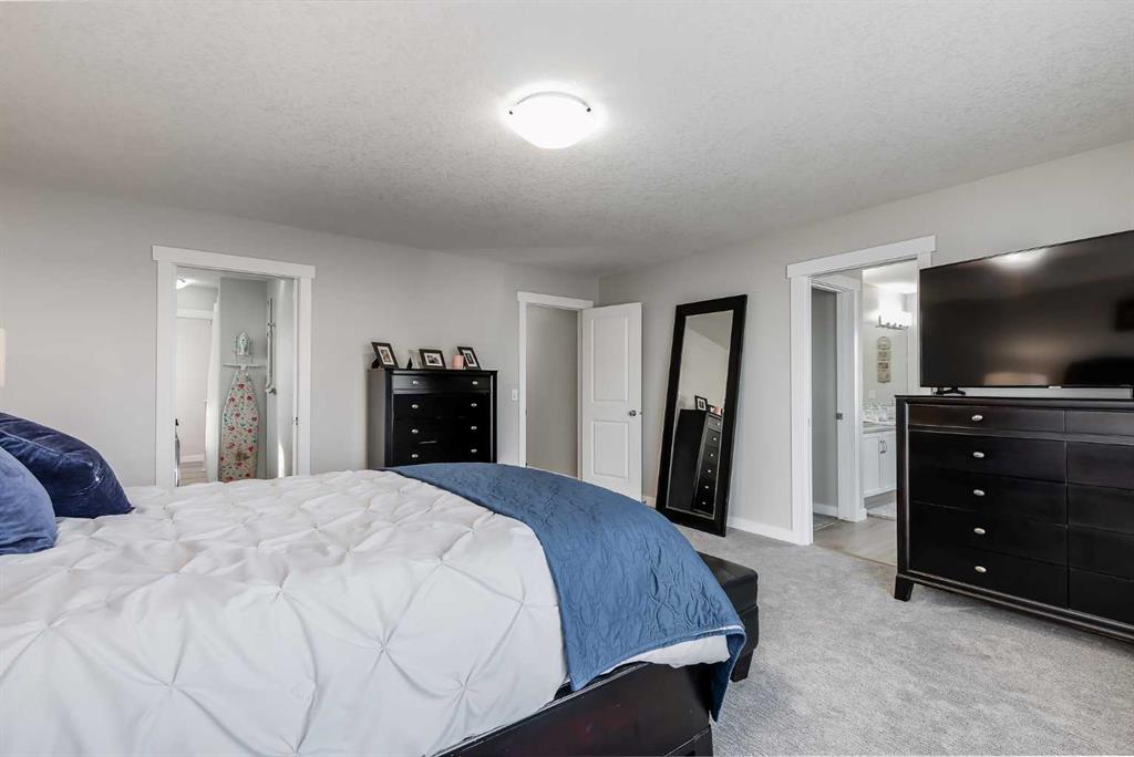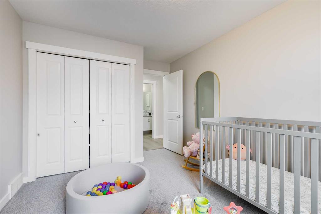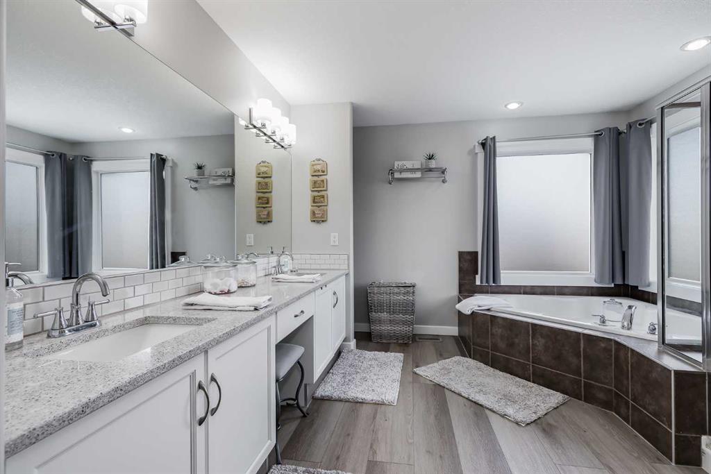 Upstairs are four spacious bedrooms, including an oversized primary retreat. The spa-inspired ensuite features quartz countertops, dual undermount sinks in a 9-foot vanity, a corner soaker tub with frosted windows, and a 6-foot glass-enclosed shower with dual shower heads and four body sprays. A large walk-in closet completes the space. The additional bedrooms are generously sized, including one with its own walk-in closet, and the main bathroom offers a double vanity, ideal for busy mornings.