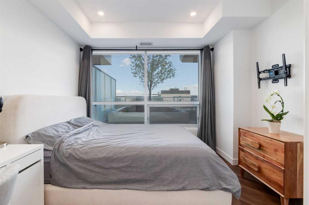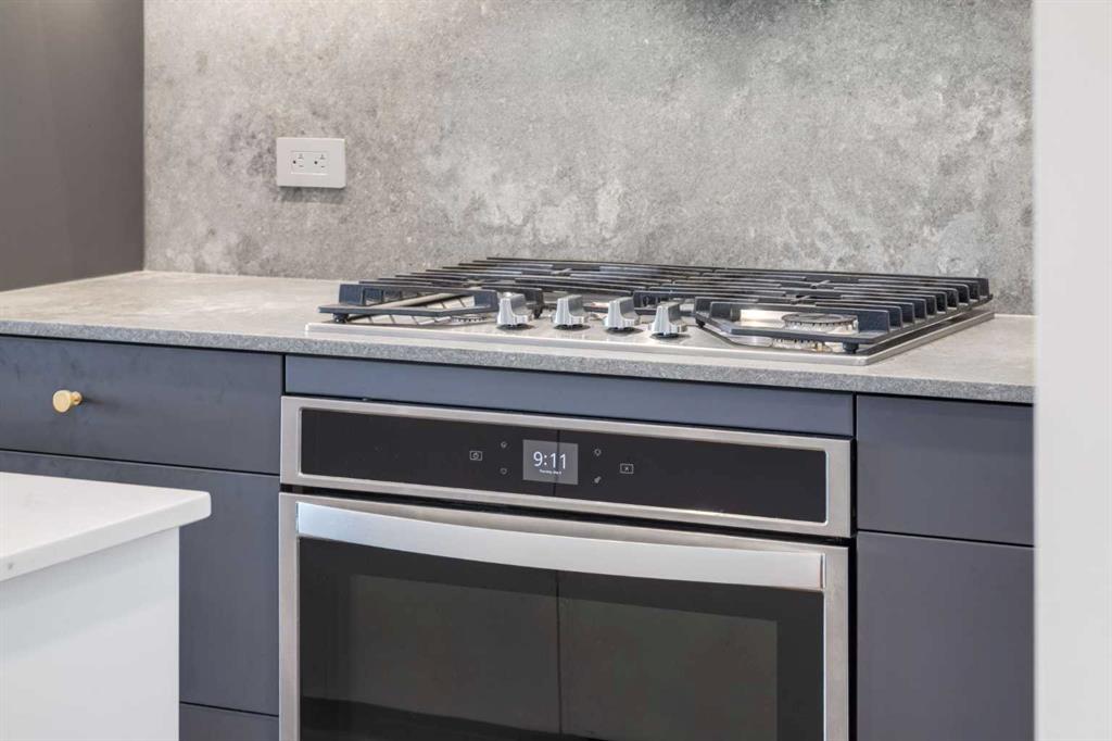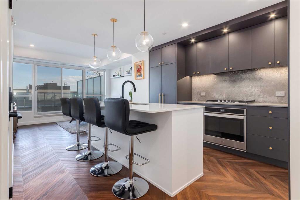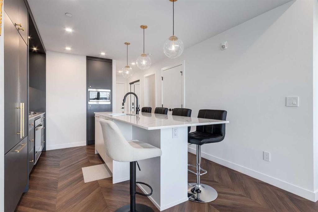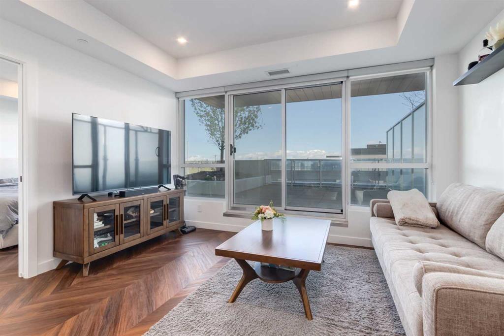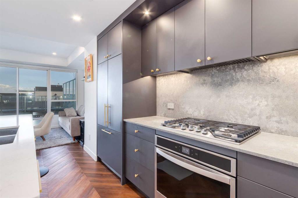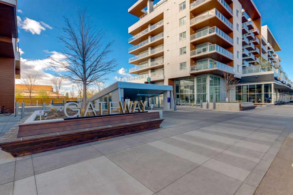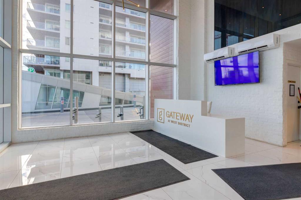 Priced to Sell! Welcome to Gateway by TRUMAN, nestled in the heart of the Master Planned community of West District. This concrete-constructed 2-bedroom, 2-bathroom home includes 1 titled underground parking stall and a spacious patio. Enjoy the pinnacle of craftsmanship and luxury with features like air conditioning, Chevron Luxury Wide plank flooring, and custom penny round mosaic tiles in all baths. LED pot lights illuminate the 9-foot+/- painted ceilings, enhancing the ambiance of the custom Chef-inspired kitchen. Finished in a luxurious Super Matte texture with brushed gold hardware, the kitchen boasts a high-end gas cooktop and wall oven, an integrated 36″ Fisher & Paykel fridge, panelled dishwasher, and soft-close custom cabinetry with under-cabinet lighting. Quartz countertops and backsplash add a touch of sophistication. Additional features include a washer & dryer and window coverings for the floor-to-ceiling glass doors that lead to the expansive private patio. Located mere steps away from popular spots such as Hot Shop Yoga, Deville Coffee House, Hankki, La Diperie Ice Cream, Una, Blanco, and more! Gateway by TRUMAN offers a lifestyle of convenience and luxury in West District’s thriving community.