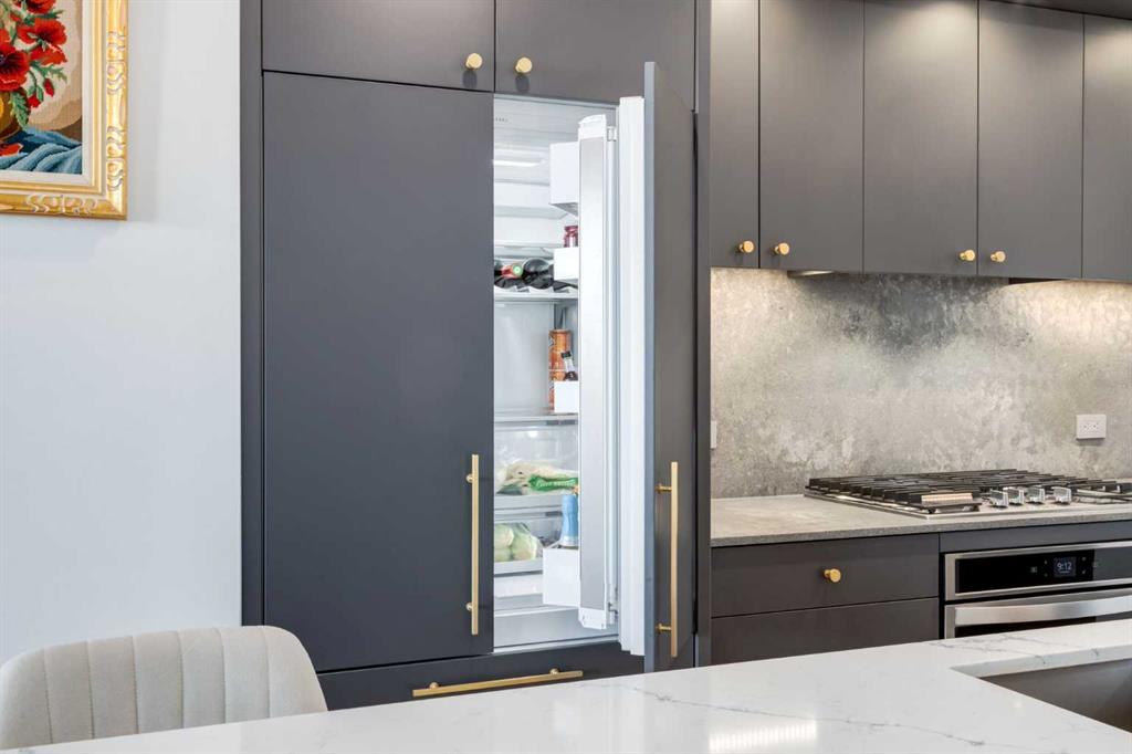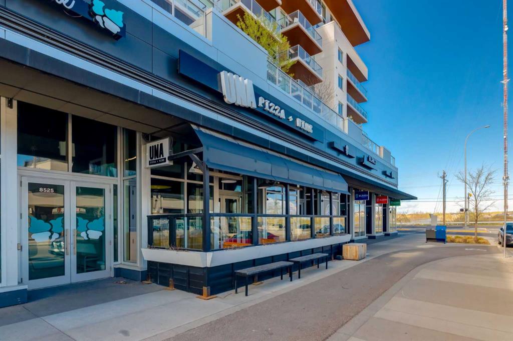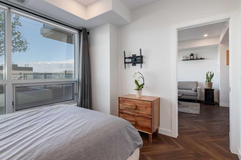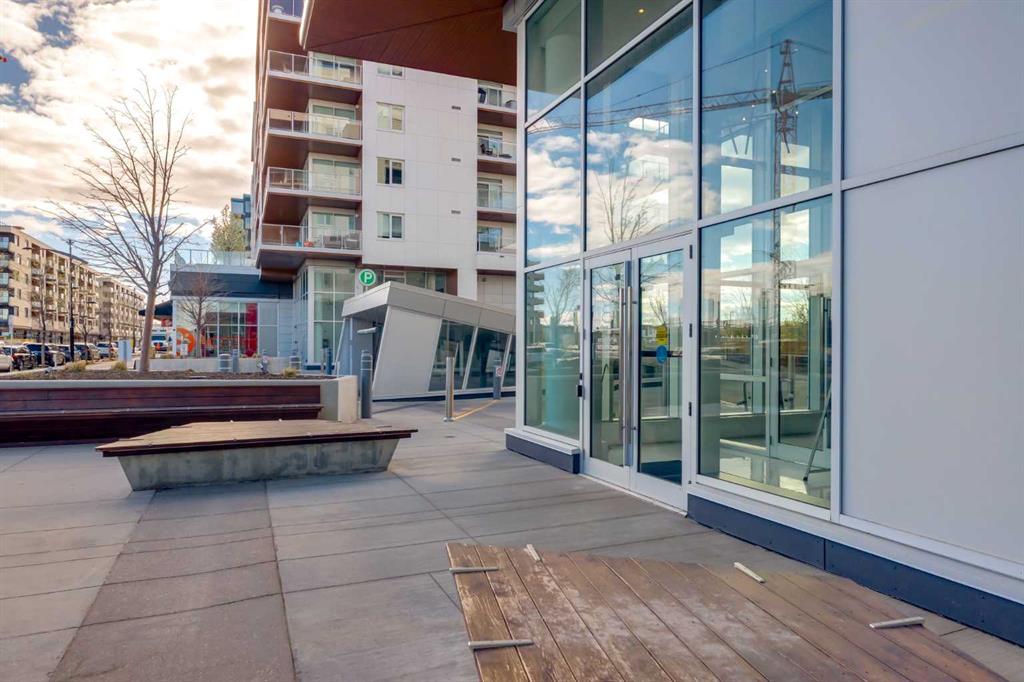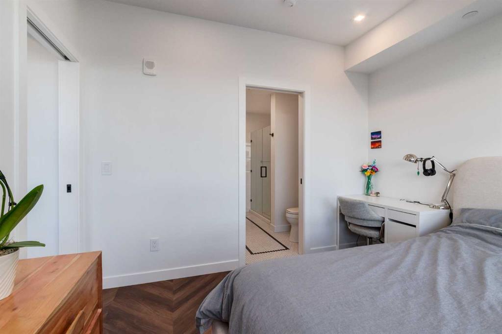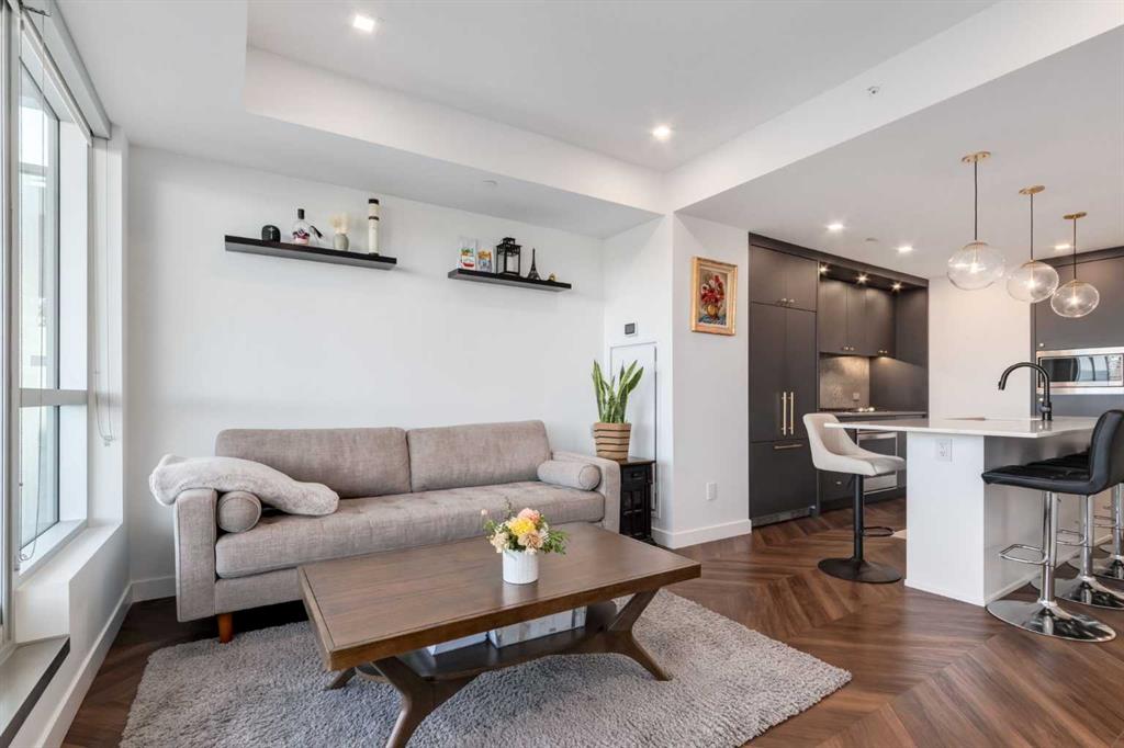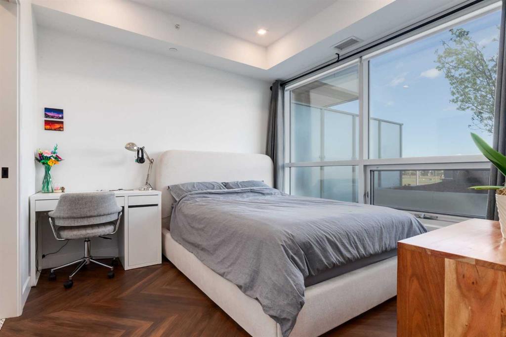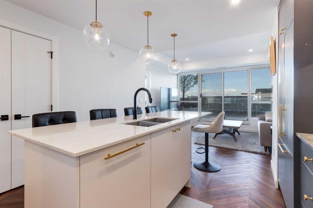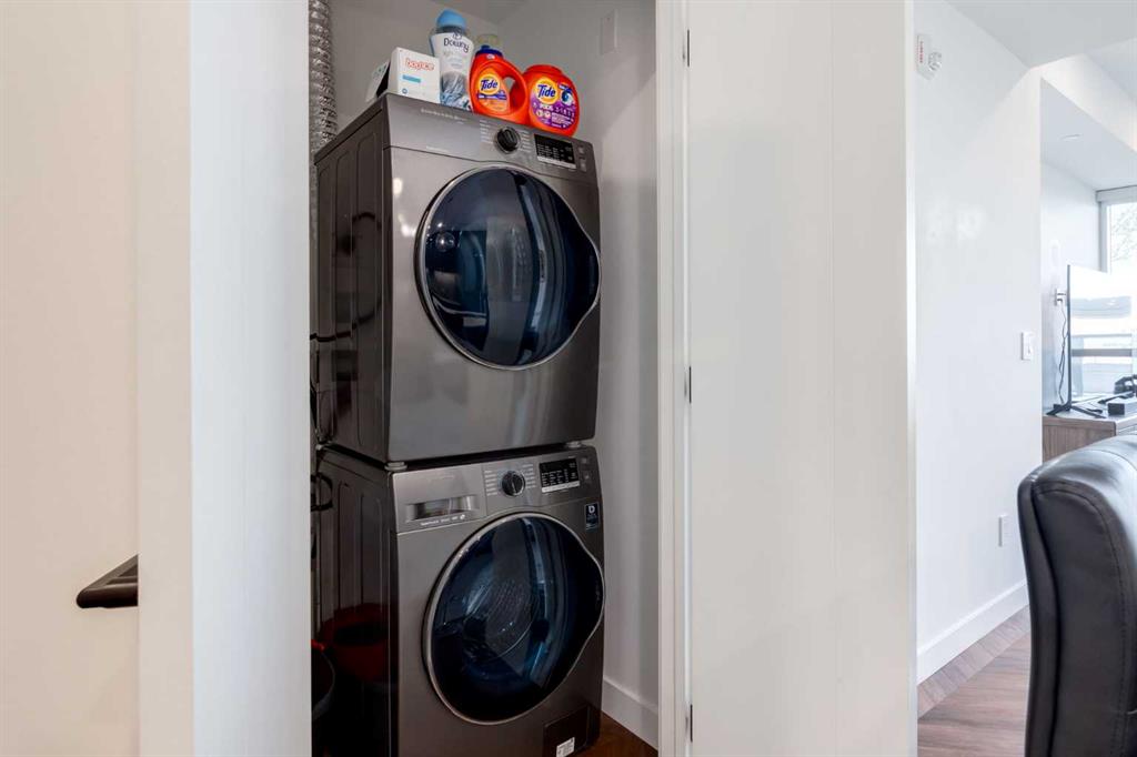 Priced to Sell! Welcome to Gateway by TRUMAN, nestled in the heart of the Master Planned community of West District. This concrete-constructed 2-bedroom, 2-bathroom home includes 1 titled underground parking stall and a spacious patio. Enjoy the pinnacle of craftsmanship and luxury with features like air conditioning, Chevron Luxury Wide plank flooring, and custom penny round mosaic tiles in all baths. LED pot lights illuminate the 9-foot+/- painted ceilings, enhancing the ambiance of the custom Chef-inspired kitchen. Finished in a luxurious Super Matte texture with brushed gold hardware, the kitchen boasts a high-end gas cooktop and wall oven, an integrated 36″ Fisher & Paykel fridge, panelled dishwasher, and soft-close custom cabinetry with under-cabinet lighting. Quartz countertops and backsplash add a touch of sophistication. Additional features include a washer & dryer and window coverings for the floor-to-ceiling glass doors that lead to the expansive private patio. Located mere steps away from popular spots such as Hot Shop Yoga, Deville Coffee House, Hankki, La Diperie Ice Cream, Una, Blanco, and more! Gateway by TRUMAN offers a lifestyle of convenience and luxury in West District’s thriving community.