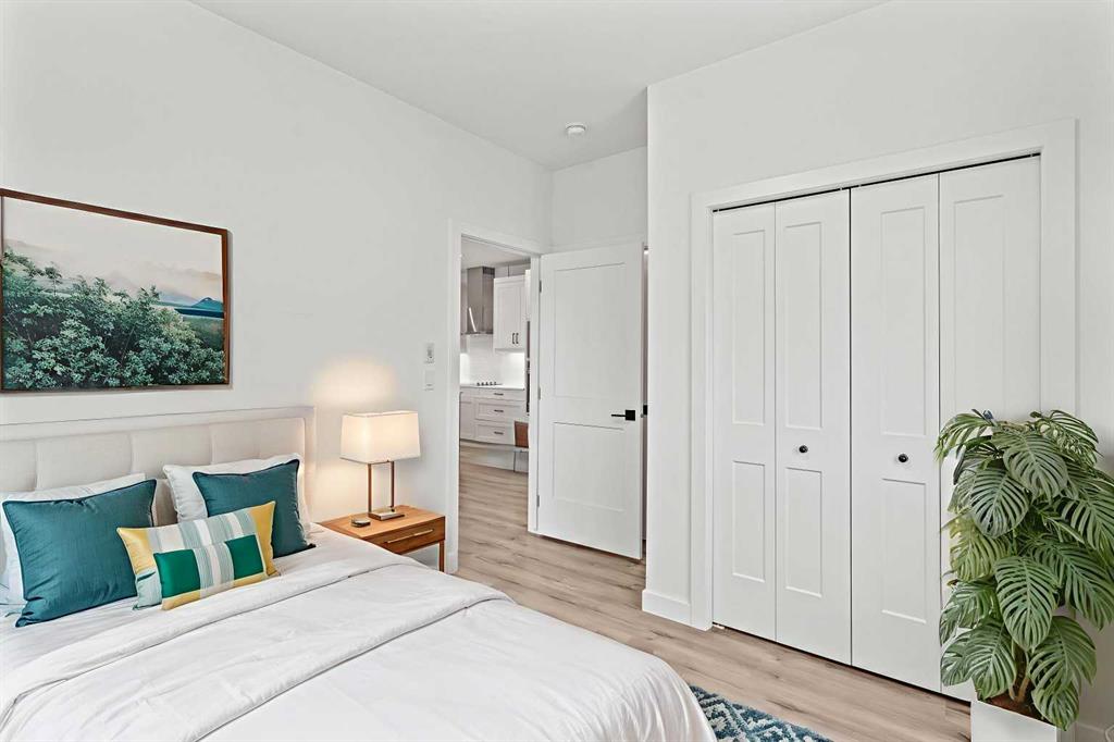 The primary suite is a private retreat, offering a generous layout, an extra-large walk-in closet with custom organizer, and a spa-inspired 4-piece ensuite complete with a tiled shower and upgraded cabinetry. The second bedroom provides excellent flexibility, enhanced by a pocket door offering direct access to the main bathroom—ideal for guests or a home office setup.