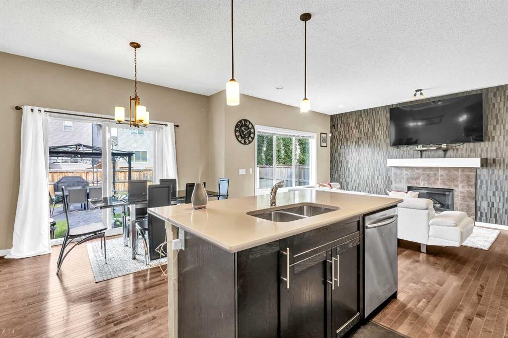 The open concept floor plan is sure to impress and is great for entertaining, large living room with center gas fireplace which is perfect to cozy up to any cold winter nights. The kitchen sits adjacent to the living room and features dark stained cabinets, quartz countertops, stainless appliances and a perfect sized island for gathering, good sized dining nook that is perfect for family dinners, and has double sliding doors that leads to your landscape retreat, park sized backyard, that is complete with stone patio and firepit, for enjoying warm summer nights.