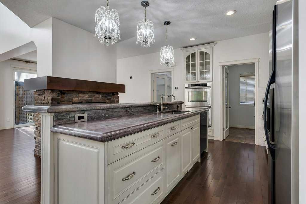 We are pleased to present this beautiful home, perfectly positioned on a large pie-shaped lot in a quiet cul-de-sac. Its striking curb appeal features a blend of stone accents and complementary stucco, setting the tone for the quality found throughout. Inside, the open floor plan showcases maple hardwood flooring, an expansive front entry, and abundant natural light from the large south-facing windows. The upgraded kitchen is a true highlight, offering a generous center island, stainless steel appliances, granite counters, gas stove, dual ovens, built-in microwave, and extensive cabinetry with elegant glass-front doors. A walk-in pantry with ample shelving connects conveniently to the mudroom and garage. A two-way fireplace adds warmth and ambience between the kitchen, living room, and dining area, all enhanced by soaring vaulted ceilings open to the upper level. The spacious main-floor office includes custom built-ins, mirrored closet cabinets, and a queen-size Murphy bed—ideal for a home workspace or an additional bedroom for guests. A well-appointed half bath completes the main floor. Patio doors with a retractable screen lead to the large south-facing patio, perfect for enjoying the sunshine. Upstairs, the primary suite features a walk-in closet and a beautifully upgraded five-piece ensuite with a luxury soaker tub, large walk-in shower, and updated fixtures. Two additional bedrooms, a four-piece bathroom, and upper-floor laundry provide comfort and convenience for the whole family. The lower level is roughed in and ready for your personal vision. Throughout the home, you’ll find custom Hunter Douglas blinds and shutters, including a remote-controlled blind for the high living-room windows. The professionally landscaped yard includes underground sprinklers with a controller, decorative lawn borders, a large latticed rear deck, an adjacent paving-stone patio, and front and back landscape lighting. The patio is equipped with a natural gas line, and both the fence and deck were re-stained in 2024. Mature trees, shrubs, and perennials offer privacy and year-round beauty. This exceptional property is ready for new owners to make it their own. The location offers the perfect balance of nature and convenience, with quick access to river pathways, community walking trails, downtown, major routes north and south, and an easy drive west to the mountains. Please note: This is an estate sale. The property and all goods are sold “as is/where is”.