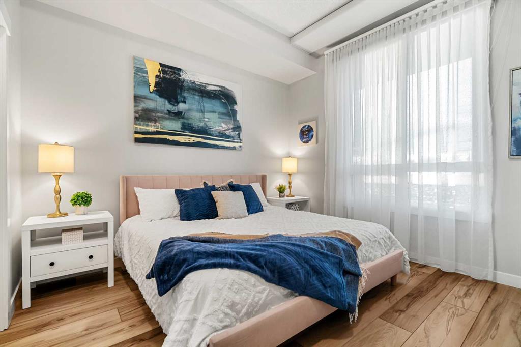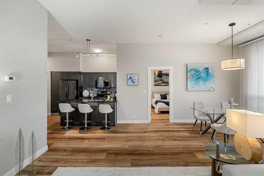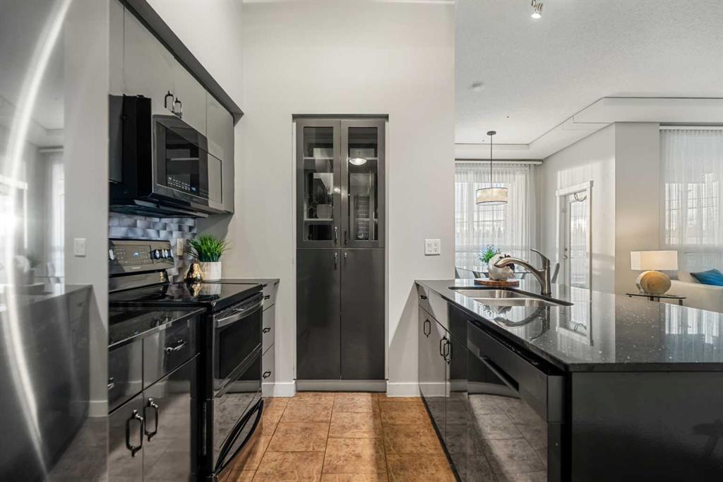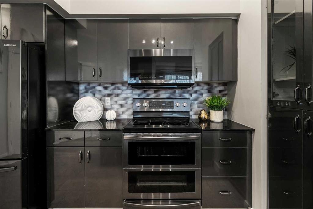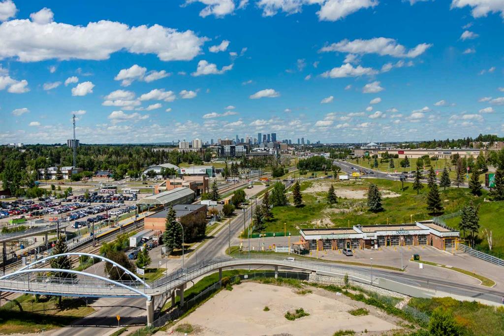 Welcome to this beautifully upgraded 2-bedroom, 2-bathroom , 2 parking stall – corner unit in the sought-after London at Heritage Station. Located on the second floor with 10-foot ceilings and a wrap-around balcony, this home offers a rare blend of space, light, and convenience and has over $50,000 in upgrades and renos— all in a concrete building with unbeatable access to amenities. This bright corner suite features windows facing north and west, allowing the home to be filled with natural light throughout the day. The open-concept layout is enhanced by wide-plank, high-end luxury vinyl plank flooring and stylish modern finishes. The kitchen has been thoughtfully updated with Newer gunmetal black appliances (all replaced within the last 3–4 years), including an electric stove with double oven option, refrigerator, microwave hood fan, and dishwasher. The cabinets have been updated with double coat of paint and new hardware in the kitchen and in both bathrooms.  Beautiful gold-flecked black granite countertops, a tile backsplash, and a double sink complete the space, making it as functional as it is striking. A new designer dining room light fixture adds a touch of elegance to the adjoining dining area that is more house sized than a typical condo perfect for family dinners or entertaining. Comfort and style continue throughout the home with automatic blinds in the bedrooms and dining room, custom drapery on all windows, new entry and primary closet doors, and additional storage above the closets in both the primary bedroom and front entry. The front entry allows for a desk space if desired or a added space for you favorite shoe collections. The living room has lots of light and lots of space for big sectionals and a large TV if desired. The primary bedroom has room for a king sized bed, lost of extra storage added above a large closet, with a lovely 4 pc ensuite. With the other bedroom on the opposite side of the unit its spacious giving everyone occupant privacy. The unit also includes a stacked washer and dryer and a tankless hot water system for added efficiency. Step outside onto your wrap-around balcony, perfect for enjoying morning coffee or evening sunsets with open sky views and great airflow from the corner positioning on the NW side. One of the biggest highlights of living at London at Heritage Station is the direct indoor access to shopping and services — no need to step outside to grab groceries, coffee, or daily essentials. Plus, you’re just steps to the C-Train station, making downtown commutes and city access effortless. Modern upgrades, generous storage, premium parking, and unmatched convenience — this is condo living at its best. Pet dog, cat or bird allowed with approval – The building has a dog run area on the north side of the building!
