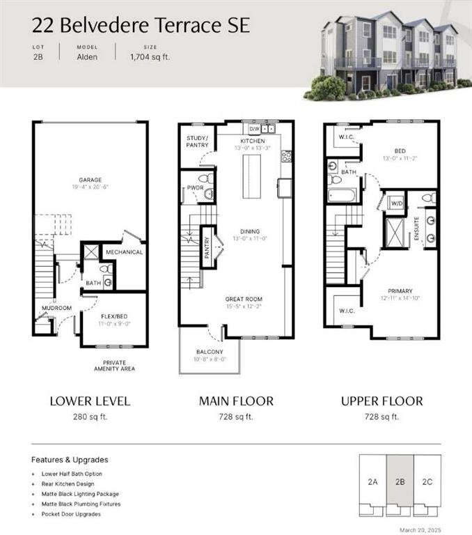 Unbeatable value! Come see for yourself! The “Alden” is one of Fifth Avenue Homes’ most popular floor plans. This 3 storey, tri-plex style townhome has over 1,700 sqft of luxury living space & a double attached rear garage with direct access into the home. The entry level has a spacious mudroom, 3 pc bath, flex room, which is perfect for a home office or gym & mechanical. The main floor, with an excellent, open plan, features a huge great room with 10×8 balcony, dream kitchen highlighted by an oversized, 5-stool breakfast bar island, Quartz countertops & custom tile backsplash, adjoining dining area, walk-in study & 2 pc bath. The upper level offers a 4 pc bath, laundry, spacious bedroom with walk-in closet & a gorgeous primary suite with walk-in closet, 4 pc ensuite (double basin vanity & 5’ step-in shower closet). High end plumbing & lighting fixtures throughout! Fifth Avenue Homes is well known for above standard finishings & attention to detail both in design & workmanship. This listing has just been completed & is ready for occupancy – pick your possession & move right in. GST included in sale price. Low condo fees of $299/month for landscaping, snow & trash removal – Builder is offering FREE condo fees for TWO years and will cover all monthly condo fees for 24 months starting the first month following the possession date. Payment details to be determined at time of an offer. The Cottages are situated in the heart of Belvedere & just minutes to all the amenities in East Hills Plaza (Costco, movie theatre, shops & restaurants), close to future CBE elementary school site & 10 minutes to downtown on the Max Purple transit. Belvedere offers a wonderful family lifestyle with parks, natural wetlands and pathways. Book a showing with your Realtor today!