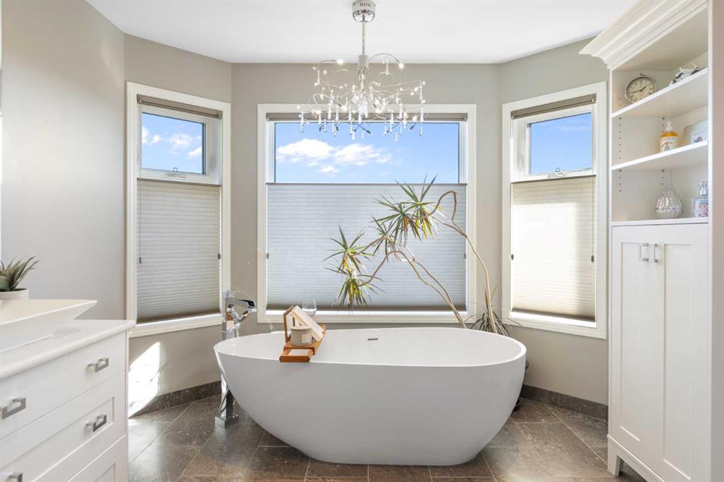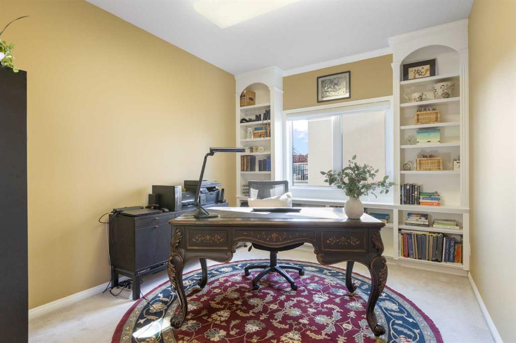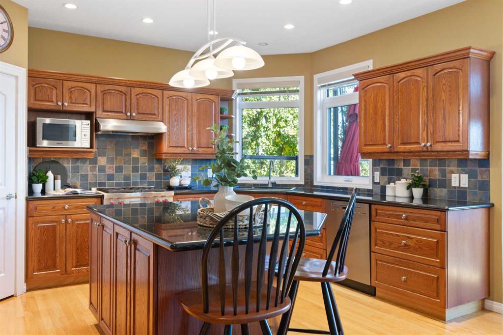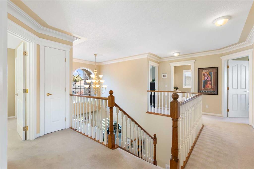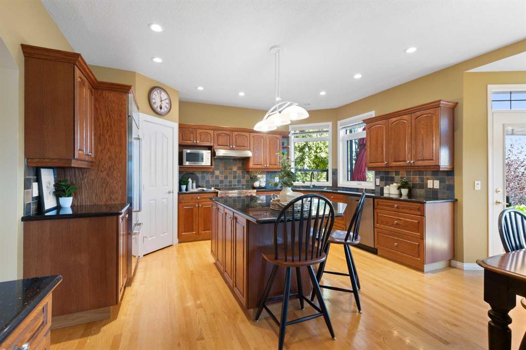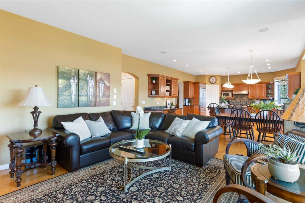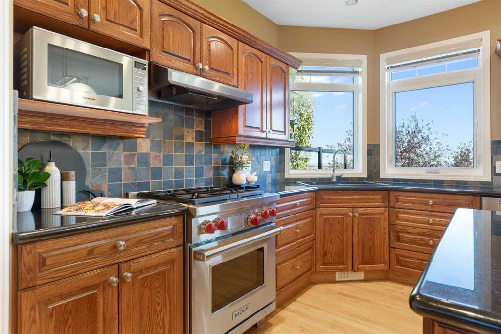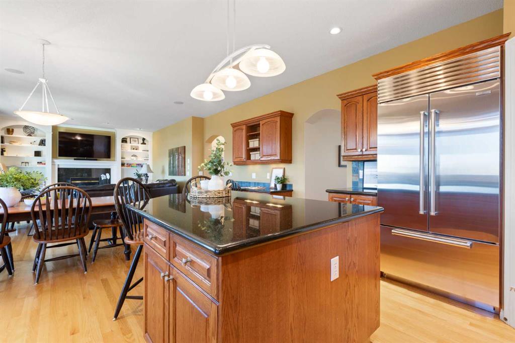 Backing onto the 16th hole of The Hamptons Golf Course, this meticulously maintained, single-owner walkout home offers nearly 4,000 sq. ft. of developed living space. Enjoy unobstructed east-facing sunrise views over the fairway, pond, and city, plus night-time city lights. The main floor features an open-concept kitchen, dining, and family area with gas-burning fireplace, main floor den with built-in cabinetry, and an upper deck with frameless glass railing and two gas connections for flexible outdoor living. The kitchen includes Sub-Zero 36” built-in fridge/freezer, Wolf 30” dual-fuel range, Panasonic microwave, Miele dishwasher, and hood fan, while Hunter Douglas window coverings enhance the main spaces. Upstairs, the home offers four spacious bedrooms, including a primary suite with custom ensuite (2015) featuring a standalone soaking tub, in-floor heating, glass-enclosed shower with rain head, custom cabinetry, and Kohler designer fixtures. TV mounts are in the living room and master bedroom. The walkout basement extends living space with a large office wired for internet and dual phone lines, custom maple cabinetry with media centre and bookcase, second gas-burning fireplace, and additional flex room ideal as a bedroom, gym, or hobby space. Direct access to a large interlocking patio provides private golf course views. An oak standalone bookcase at the bottom of the stairs is included. Other features include LG washer & dryer, two Amana high-efficiency furnaces, central A/C, two water heaters (2025), Kinetico water system, Vacu-Flo system with attachments, updated vinyl-clad windows (2015–2021), oversized two-and-a-half-car garage with large driveway, and a programmable in-ground irrigation system. Located on a quiet street and maintained as a no-pet home, this property combines exceptional design, premium finishes, and a premier golf course setting in The Hamptons, close to parks, schools, walking paths, and convenient access to Stoney Trail, Country Hills Boulevard, and Shaganappi Trail.