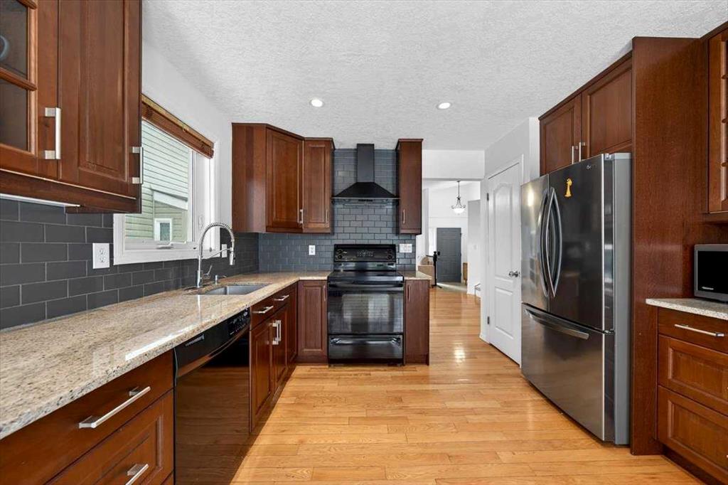 MOVE-IN READY & BEAUTIFULLY UPDATED! Welcome to this freshly painted home in a mature community offering over 2,300 sq ft of fully finished living space with 4 bedrooms and 3 bathrooms, ideally backing directly onto Shawinigan Park with no neighbours behind. Located at 22 Shawinigan Rise SW, this exceptional family home is just a short walk to schools, shopping, and the LRT. Upon entry, you’ll appreciate the new paint throughout, gleaming hardwood floors, updated fixtures, and vaulted ceilings in the living and dining areas that create a bright, open space perfect for entertaining. The fully updated kitchen features stainless steel appliances, custom cabinetry, and stone countertops, ideal for the chef in the family. The main floor opens onto a rear deck overlooking the park, complete with a private gate to Shawinigan Park, professional landscaping, and an irrigation system. Upstairs, the spacious primary bedroom includes an updated 4-piece ensuite and built-in closet organizers, along with two additional bedrooms and another full bathroom. The fully developed lower level offers a HUGE family room with a tile surround gas fireplace, a fourth bedroom, and a full bathroom, perfect for guests or young adults, Finished 4th level with a rare 200+ sq ft private gym, laundry room with sink and a storage area with racks making this a truly outstanding home in an unbeatable location. Check out Virtual Link for more information.