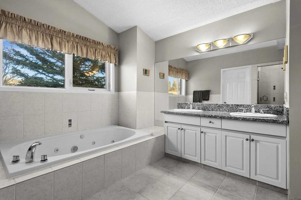 The main floor includes a spacious Master bedroom complete with a large walk-in closet and ensuite featuring a soaker tub and separate shower, a generously sized second bedroom with access to the main floor 4pc bath, the home office with French doors can also be used as a bed room, and a laundry room.