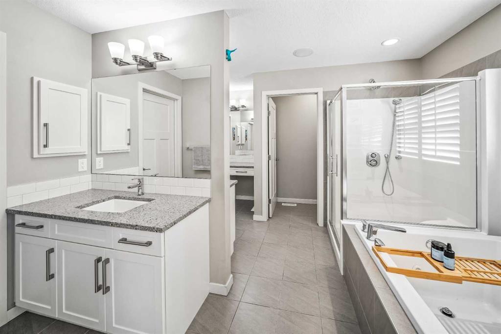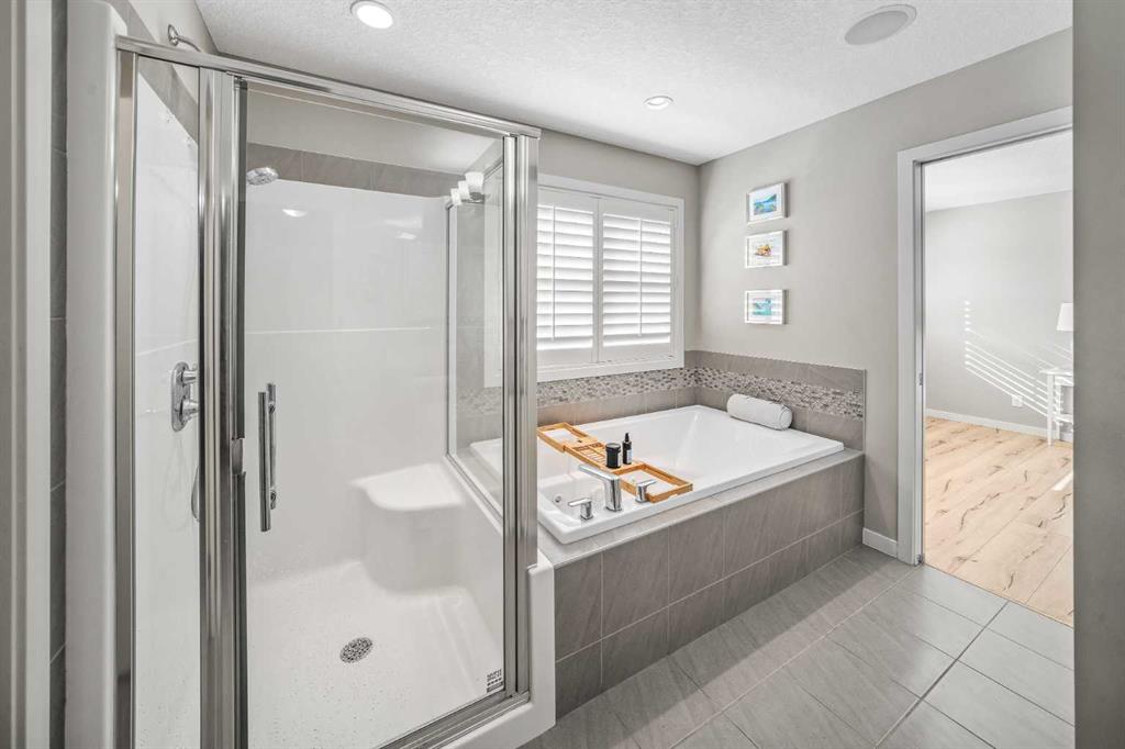 Upstairs, a bright and spacious bonus room provides a versatile retreat for work or play. The primary suite feels like a private sanctuary with dual walk-in closets and a spa-inspired ensuite featuring quartz-topped double vanities and a deep soaker tub. Two additional bedrooms share a beautifully designed bathroom with double sinks and a separate shower and toilet area, offering both function and privacy for family or guests. Upper-level laundry completes the space, ensuring that practicality meets elegance at every turn.
