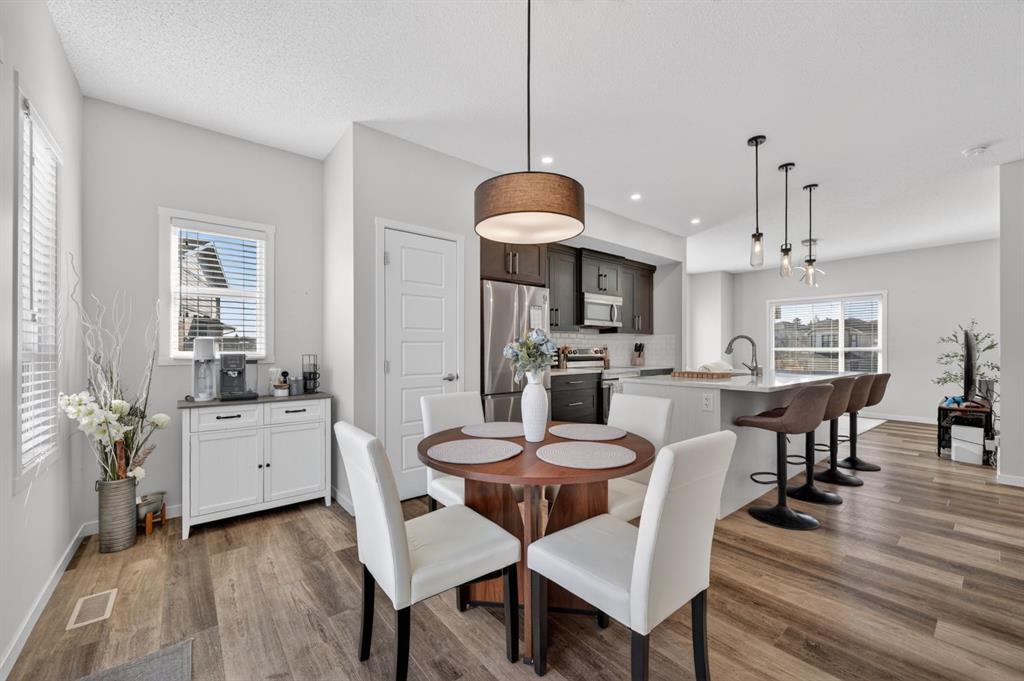 Welcome to this beautifully maintained corner unit townhouse in the sought after community of Harvest Hills the perfect blend of comfort convenience and lifestyle. This bright and airy 2 bedroom 2.5 bath home features a modern open concept layout designed for both everyday living and entertaining. The main floor flows seamlessly from the spacious living area into the dining space and kitchen creating a warm and inviting atmosphere. Large windows throughout the home flood the space with natural sunlight enhanced by the desirable south facing exposure along the side of the property. Upstairs you will find two generously sized bedrooms each offering privacy and functionality ideal for young professionals couples or small families. The 2.5 bathrooms ensure convenience for both residents and guests. Enjoy the practicality of a single attached garage offering secure parking and additional storage along with the benefits of a corner unit with extra privacy more windows and an overall brighter living experience. Location is where this home truly shines. Situated just minutes from Deerfoot Trail and Stoney Trail commuting anywhere in the city is quick and efficient. Plus you are only about 10 minutes from Calgary International Airport making travel incredibly convenient. Harvest Hills offers fantastic nearby amenities including grocery stores restaurants cafes schools parks and scenic walking paths. Enjoy easy access to Harvest Hills Lake Vivo Recreation Centre and shopping hubs like Country Hills Town Centre all just a short drive away. Whether you are a first time buyer investor or looking to downsize without compromise this home offers incredible value in a well connected family friendly neighborhood.