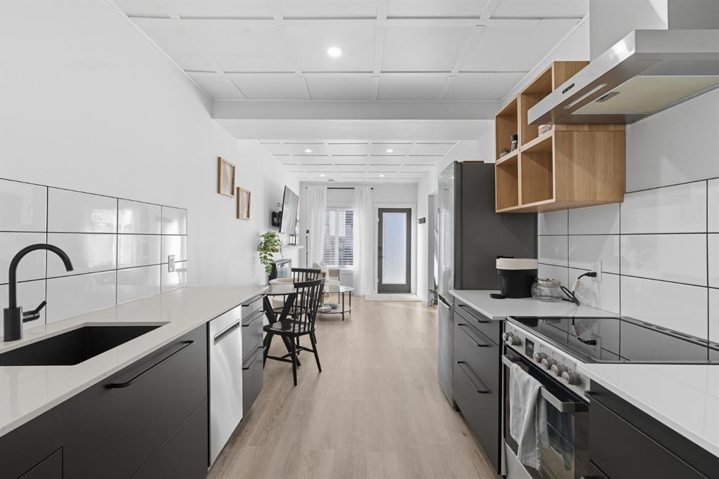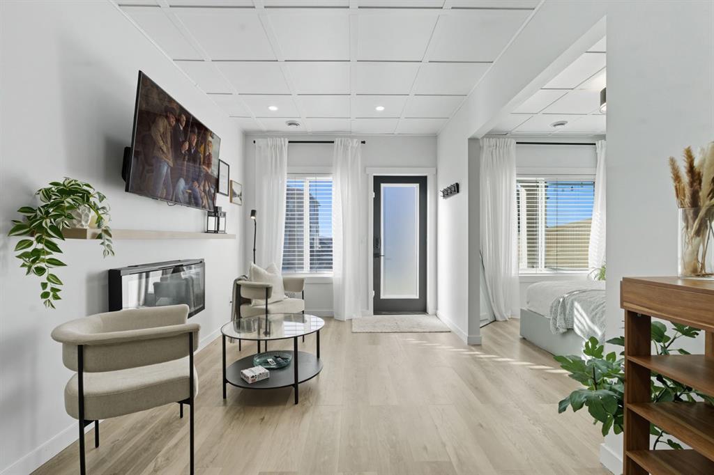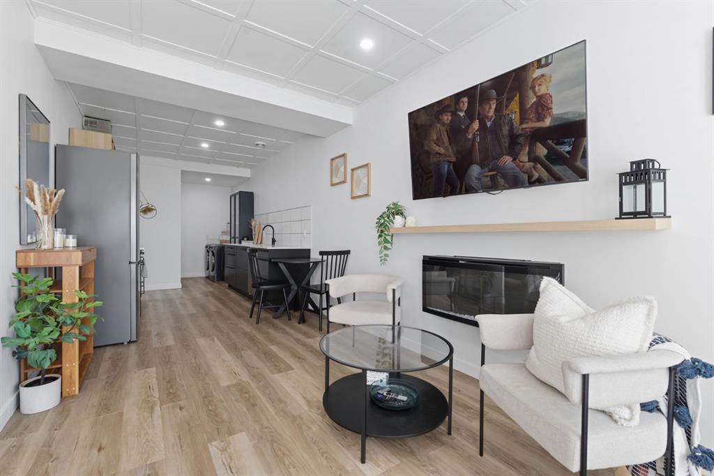 Step inside to discover a bright, open-concept main floor featuring luxury vinyl plank flooring, stylish finishes, and a chef-inspired kitchen with stainless steel appliances, quartz countertops, and ample cabinetry for all your storage needs. The inviting living area centres around a modern electric fireplace and opens onto a sun-soaked south-facing deck and backyard—perfect for entertaining or relaxing.