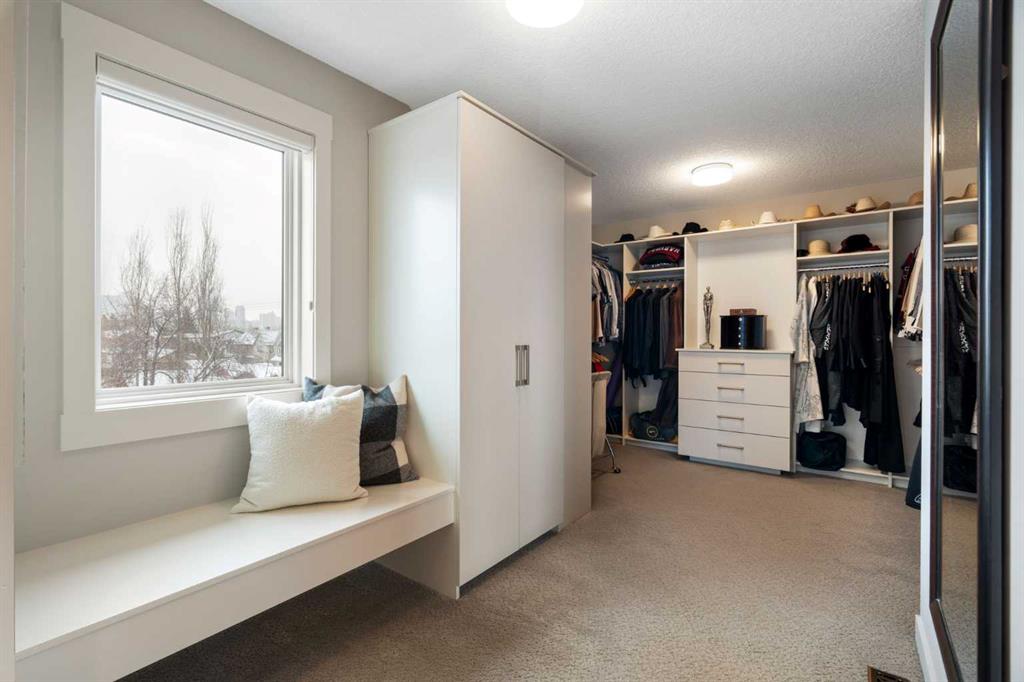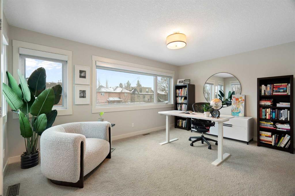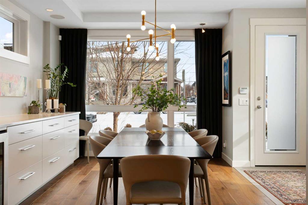 Welcome to 2201 Bowness Road NW, a rare and beautifully curated four-level home in one of West Hillhurst’s most sought-after pockets. Situated on a prime corner lot, this exceptional residence offers stunning downtown views, a sunny south-facing backyard, and over 3,700 sq. ft. of thoughtfully designed living space. Natural light pours through strategically placed oversized windows across every above-grade level, creating a bright and inviting atmosphere throughout. The main floor is a true showpiece, featuring engineered hardwood, striking open-riser wood staircases, and a statement raw metal gas fireplace. At the heart of the home is a nearly 16-foot waterfall island with built-in storage and integrated seating, perfectly paired with a chef-inspired kitchen complete with premium Sub-Zero, Miele, and JennAir appliances, custom cabinetry, and designer lighting. Sliding doors open seamlessly to the pergola-covered patio, extending the living space outdoors. The second level is ideal for family living, offering spacious secondary bedrooms, custom closet built-ins, a rare 6-piece bath with heated floors, a flexible bonus/family room, and access to the first upper deck. One of the bedrooms enjoys beautiful south-facing downtown views. The entire third level is dedicated to an exceptional primary retreat — a true private sanctuary. Enjoy your own covered balcony, wet bar and coffee station, custom open closet, and a luxurious 5-piece ensuite with heated tile floors, freestanding tub, and a stunning two-way fireplace. The fully developed basement offers 9-foot ceilings, a large recreation room with full wet bar, guest bedroom, full bathroom, and rough-in for in-floor heat. Outdoor spaces have been professionally curated with composite decking, pergola, mature landscaping, lighting, and rebuilt upper decks with vinyl decking and metal cladding. Additional features include air conditioning, zoned heating and cooling, Hunter Douglas blinds, built-in speakers, Vacuflo, Kinetico water system, security system, and insulated garage with Gladiator storage. A truly exceptional inner-city offering just minutes to downtown, Kensington, the Bow River pathways, and some of Calgary’s best amenities.