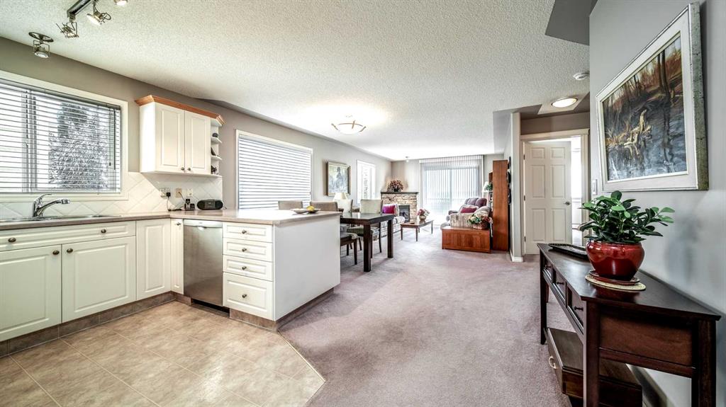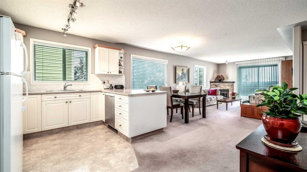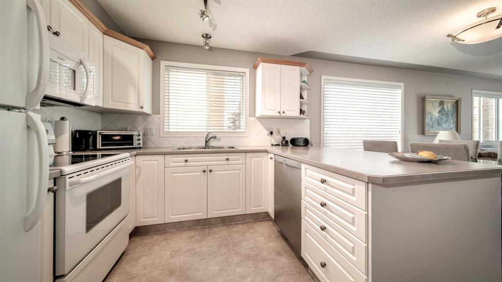 Fabulous 2 bedroom, 2 full baths, end unit in Mountain View Terrace in Springbank Hill! Meticulously maintained, this bright and open corner unit is inviting and perfect for entertaining, offering, a spacious living/dining room with corner gas fireplace and open to a sparkling, white kitchen with ample cupboard and counter space. The master bedroom is complimented by a generous walk-in closet and huge 4-piece ensuite. The second bedroom is conveniently located on the other side of the unit providing privacy and ease of access to main bath. New stacked washer and dryer (2024) and new microwave hood cover (2025)! Enjoy a large, south facing deck including exterior storage room, in-suite laundry and a secured underground, titled parking stall with additional caged storage in front of stall. Perfect location! A wonderful place to call home!