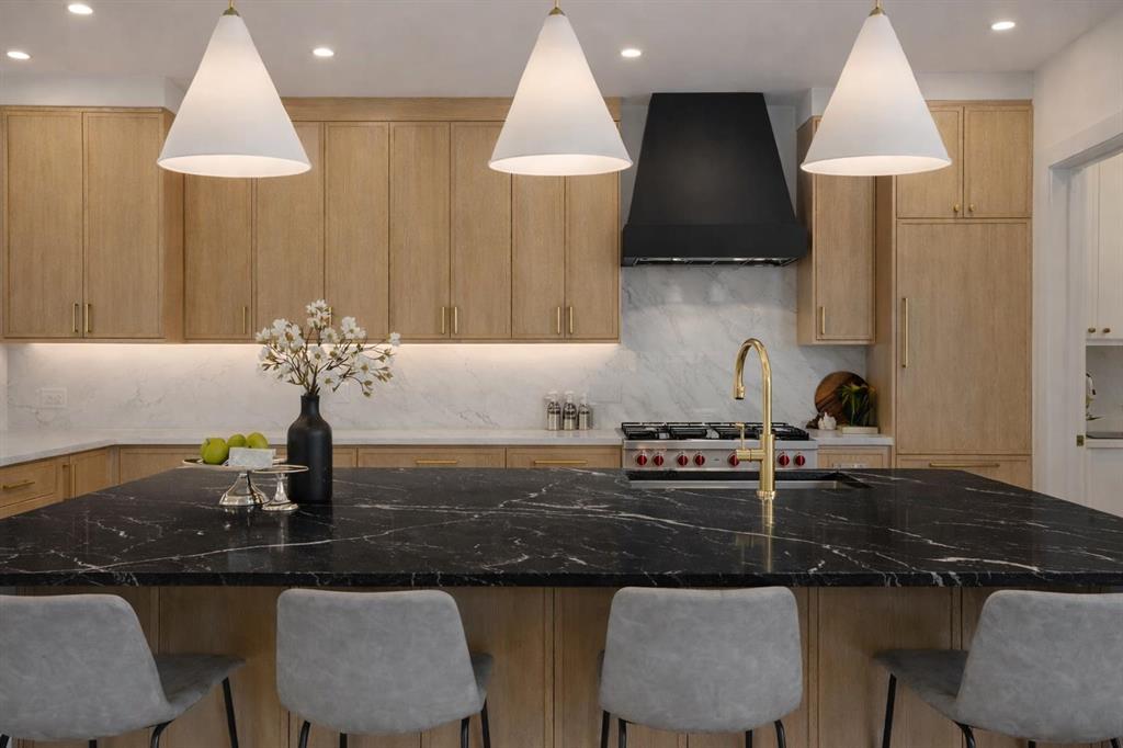 Upon entry, a bright front office with glass-paneled doors provides the perfect work-from-home space. The main floor unfolds into the heart of the home — a chef-inspired kitchen featuring custom cabinetry, dual paneled fridge/freezer units, a premium gas range, paneled dishwasher, a large waterfall island, and a fully outfitted custom walk-through butlers pantry. The adjoining living room invites gatherings around the striking gas fireplace while oversized windows overlook the landscaped yard and oversized deck
