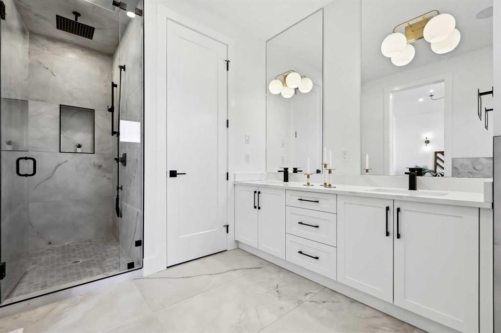 The upper level features a spacious primary suite, designed as a tranquil retreat with a luxurious ensuite that includes a steam shower and double vanity. Two additional well-appointed bedrooms, a modern bathroom, and a conveniently placed laundry room complete this floor.