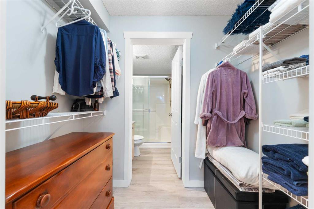 The primary bedroom is a relaxing retreat with a ceiling fan, sunny south-facing exposure, and a walk-through closet leading to a private 3-piece ensuite with a glass sliding shower. The second bedroom also enjoys south-facing views overlooking a peaceful walking path. A full 4-piece main bathroom, in-suite laundry, and additional storage add to the home’s everyday convenience.