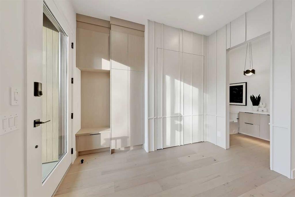 Step inside to a bright, airy foyer where clean millwork and a built-in bench create an organized and understated welcome. A discreet, hidden door conceals the powder room, maintaining the seamless, minimalist aesthetic that defines the main floor. The open-concept layout is enhanced by 10-foot ceilings, oversized windows, and warm natural finishes that reflect Scandinavian simplicity while mid-century inspired lighting and architectural detailing add depth and character.