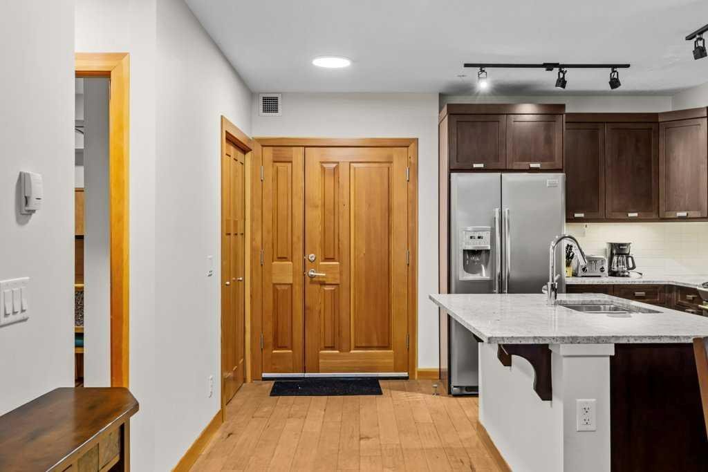 This inviting 2-bedroom, 2-bath residence offers 921 sq. ft. of thoughtfully designed living space, blending comfortable gathering areas with private retreat zones. Beautifully upgraded throughout, the home features a modern kitchen and bathrooms enhanced by custom wood cabinetry and quality finishes that add warmth and character. Sold fully furnished, this turn-key property is ideal for personal or family use, or as a long-term rental mountain retreat. You will love being able to entertain in the main living area which seamlessly blends living space with meal prep and dining – perfect for building memories! The primary bedroom serves as a relaxing sanctuary complete with an updated ensuite, while the den’s murphy-style bed allows that space to function seamlessly as both a home office and an additional bedroom. Located in the highly sought-after Serenity Ridge development in Stewart Creek, residents enjoy a quiet, peaceful setting with easy access to walking and biking trails, golf, shopping, and schools. The building offers excellent amenities including secure underground parking, onsite storage, a hot tub, and an owner’s lounge. With its stylish design, flexible layout, quality finishings, added storage, and exceptional location, this move-in-ready home deserves a place on your short list—come see for yourself: the Canmore lifestyle is calling you “HOME”.
