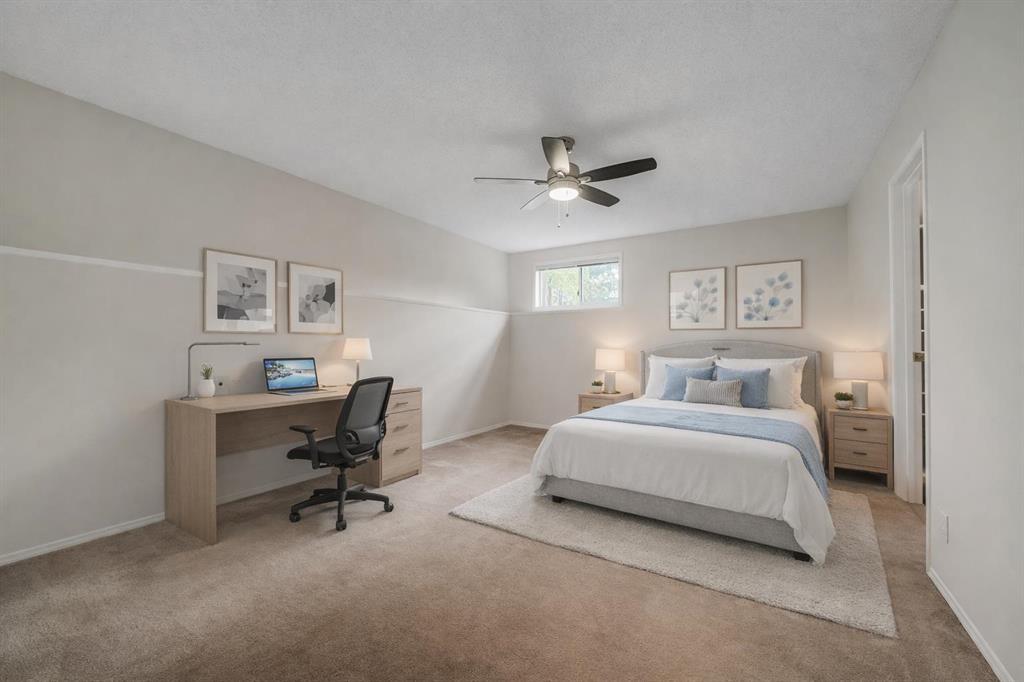 Located in the desirable community of Diamond Cove and tucked into a quiet cul-de-sac just steps from the Bow River and Fish Creek Park pathway system, this well-maintained home offers five bedrooms, two and a half bathrooms, central air conditioning, and an attached heated garage with epoxy flooring. Set on a 6,700+ sq. ft. lot, the southwest-facing backyard features mature trees, no direct neighbours behind, and backs onto a small greenspace and lane, creating a private and peaceful outdoor setting. The main level includes a bright living room with bay windows and hardwood flooring, a kitchen with stainless steel appliances and a breakfast bar, and a dining area that opens to the large balcony. The balcony is finished with composite decking and has stairs leading directly to the expansive backyard. Three bedrooms are located on this level, including the primary with a four-piece ensuite and walk-in closet, along with a two-piece bathroom with a rough-in for a shower. The fully developed lower level offers large windows, two generously sized bedrooms with walk-in closets, a full bathroom, and a spacious recreation room with a gas fireplace. There is excellent storage throughout, including a dedicated storage closet and a large laundry/mechanical room. Recent updates include fresh interior paint, blown-in insulation in the garage attic, and plumbing upgrades throughout the home. A move-in ready property in a sought-after location close to parks, pathways, schools, amenities, and major routes.