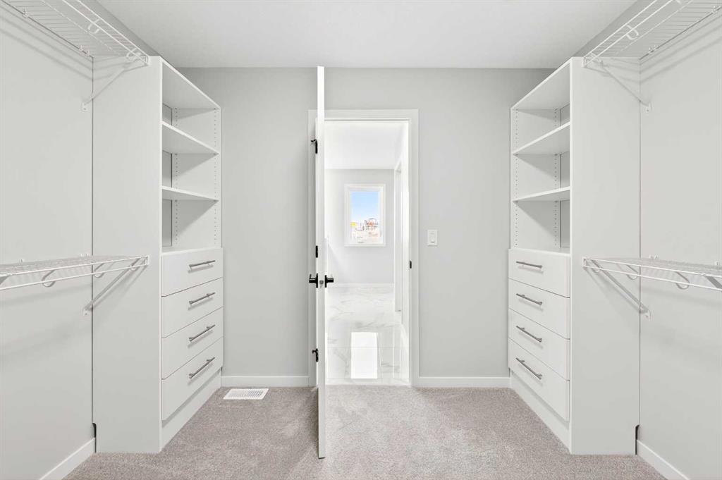On the upper level, a central Family/Bonus Room provides a comfortable gathering space for the household. The Primary Suite offers a 4-piece ensuite with double vanity and a large walk-in closet with custom organizer. Two additional Bedrooms — each with their own walk-in closet — share a full 4-piece Bathroom. Both secondary Bedrooms enjoy a permanent greenspace view with no home ever planned on the street across. A generous Laundry Room with plenty of storage and organizers adds everyday convenience.
