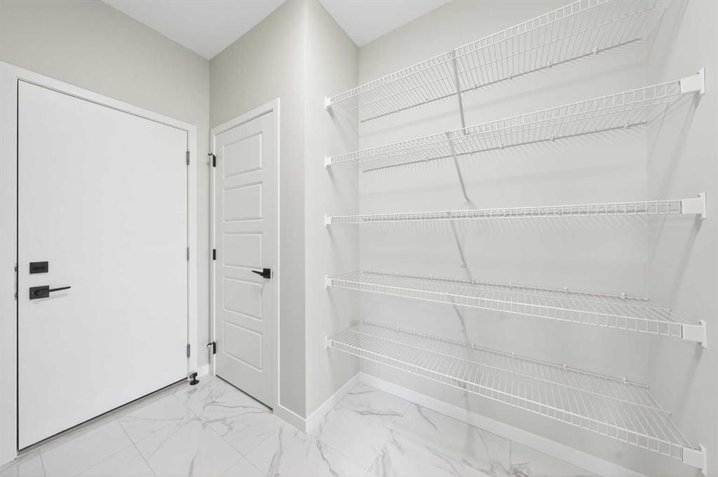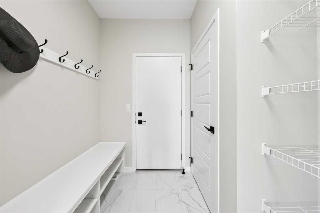 Step inside to discover 9-ft ceilings and durable vinyl plank flooring that flow throughout the open Main Level. The well-appointed Kitchen impresses with a centre island and breakfast bar, quartz countertops, stainless steel appliances, and a walk-through pantry — seamlessly connecting to the Dining Area and a bright east facing Living Room featuring a sleek electric fireplace and large windows. A sliding door opens to the rear Deck with aluminum railing. A Powder Room and well-organized Mud Room with built-in bench and clothes hanger complete this level.