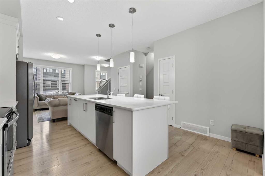 DOUBLE ATTACHED GARAGE with PARKING PAD, and green space. 1600 sq/ft TOWNHOME in the upscale community of New Brighton. The front patio area faces a sunny green space and walkway providing the perfect space for you to sit and relax. Upon entering you are greeted with a LARGE foyer with TONS of storage, a separate laundry room and access to your attached double garage with a full double driveway to allow for extra parking. Upstairs on the second level is a bright airy common space with lofty 9 FT CEILINGS. The spacious bright kitchen features white QUARTZ countertops, full upper cacbinets, a pantry and an OVERSIZED 10 FT ISLAND – perfect for entertaining! The dining area provides ample seating space. while the bright living room flows seamlessly onto the covered balcony with a gas line BBQ hookup. Adjacent to the living area, you’ll find a handy office nook. A 2-piece guest bath adds extra convenience. Third level is the Master Bedroom with WALK-IN closet and 3 pce ENSUITE bathroom. Two additional Bedrooms and another 4pce bathroom complete the upstairs. Don’t miss this opportunity to live in this beautiful area. This home has everything you or your young family needs. Close to Parks, Schools, South Trail Crossing Shopping, Transit, New Brighton Community Center and Athletic Park with Skating, Water Park, Tennis & more!