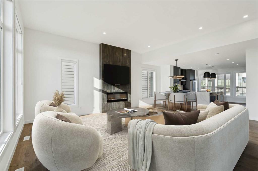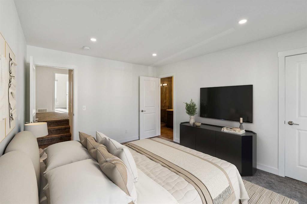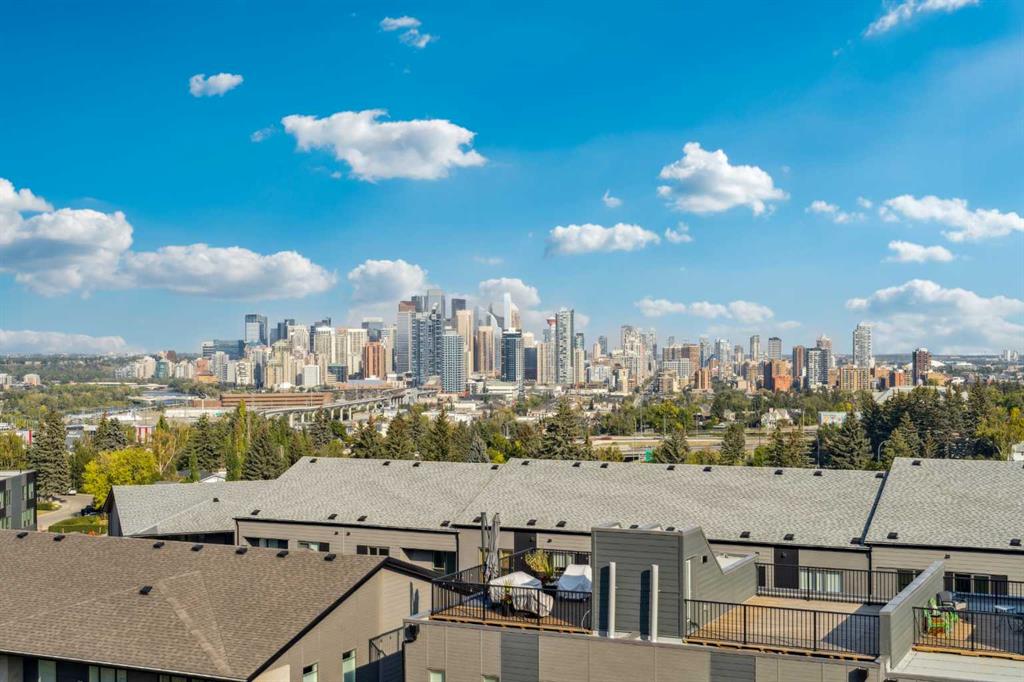 OPEN HOUSE SUNDAY FEBRUARY 15TH 12-2P.M. Perched at the highest point in Crown Park with the BEST VIEWS in the complex, this sophisticated Rouge walk out end-unit townhome was one of the first sold by the developer, offering a rare blend of urban convenience, contemporary design and DIRECT CITY SKYLINE VIEWS FROM 3 LEVELS setting it apart from other units (NO GST!). Steps from walking paths, parks, the Bow River, and LRT access, this home places the best of the city and nature right at your doorstep. A private east-facing front patio overlooks the community’s expansive green space and beautifully maintained raised garden beds — an inviting introduction to the lifestyle that awaits. Inside, the entry-level welcomes you with a flex space ideal for a home gym, office, or studio, as well as access to a private double attached garage with additional storage. Ascend to the main living level, where soaring ceilings and a sun-drenched open floor plan define the heart of the home. The chef-inspired kitchen features a premium stainless steel appliance package, sparkling quartz countertops, and a waterfall island. A stylish adjacent bar area, complete with wine fridge and additional cabinetry, is perfect for entertaining and crafting your signature cocktail. The dining room serves as the hub for hosting memorable meals, while the spacious living room centers around a sleek linear gas fireplace ready with TV wall mount already installed. Step out onto the east-facing balcony, with full city views, overlooking the community’s tranquil green space—perfect for morning coffee or evening unwinding. On the upper level, discover three well-appointed bedrooms, a bonus flex area, and convenient upper laundry. The primary suite features a 4-piece ensuite and walk-in closet, while two additional bedrooms share a beautifully designed 3-piece bath. The central bonus area offers a perfect spot for a kids’ play area, study nook, or cozy reading lounge. But the true showstopper awaits above — the private rooftop patio. With the best direct views of Calgary’s downtown skyline to the east when sitting and enjoying the sun and glimpses of the west, this incredible outdoor living space is your personal retreat to watch both sunrises and sunsets in style. This energy-efficient home is thoughtfully designed and EnerGuide-rated, seamlessly blending luxury with sustainability. Located in a community that connects urban living with natural beauty, you’ll enjoy access to the Douglas Fir and Quarry Trails, dog-friendly parks, boutique fitness studios, and some of Calgary’s top dining and entertainment spots. With Bow Trail and the LRT just minutes away, you’re effortlessly connected to downtown and the mountains alike. Whether you’re entertaining guests, working from home, or escaping to the rooftop to soak in the skyline, this Crown Park masterpiece offers an elevated lifestyle in one of Calgary’s most dynamic new communities.