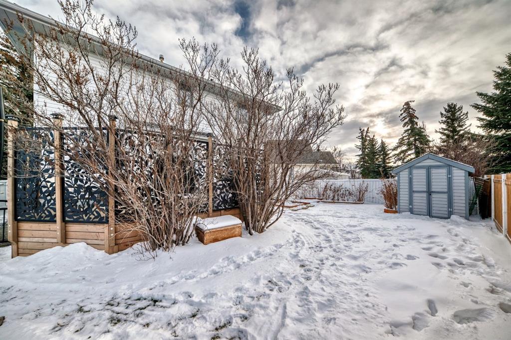 The sunny west-facing backyard is designed for relaxation and entertaining, featuring mature landscaping, a new deck, newer fencing, black decorative lattice privacy screening, a natural gas BBQ hookup, a storage shed, and a charming vegetable garden with perennials, including well-established raspberry bushes that add both character and seasonal enjoyment.