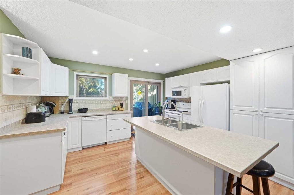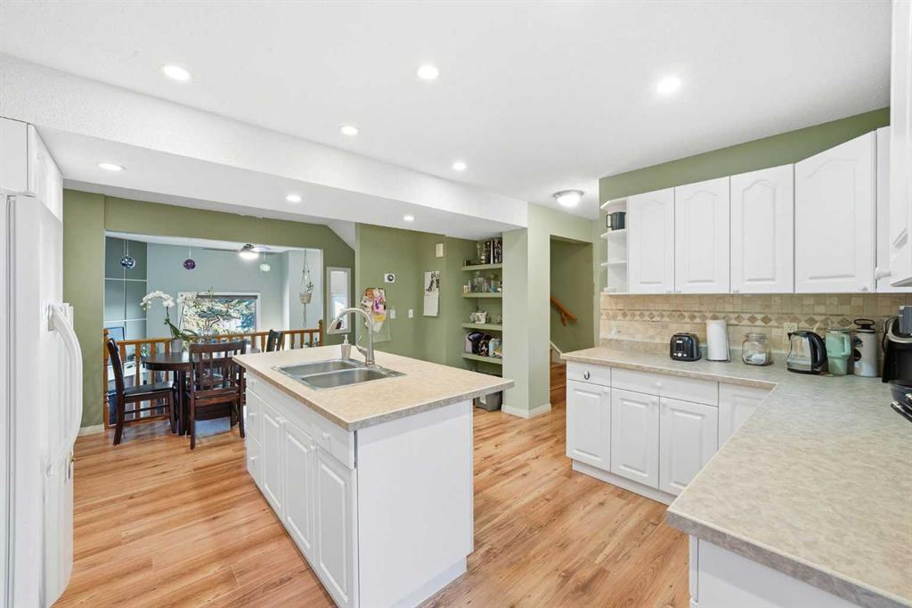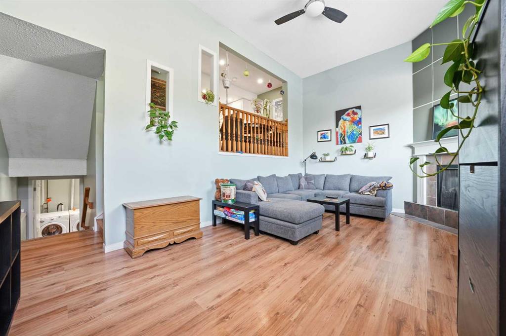 The home opens into a warm and welcoming living room with vaulted ceilings and a corner fireplace, creating an ideal gathering space for movie nights or evenings by the fire. Just a few steps up, the bright, open kitchen and dining area offers ample cabinetry, generous prep space, and a centre island perfect for casual meals or entertaining.