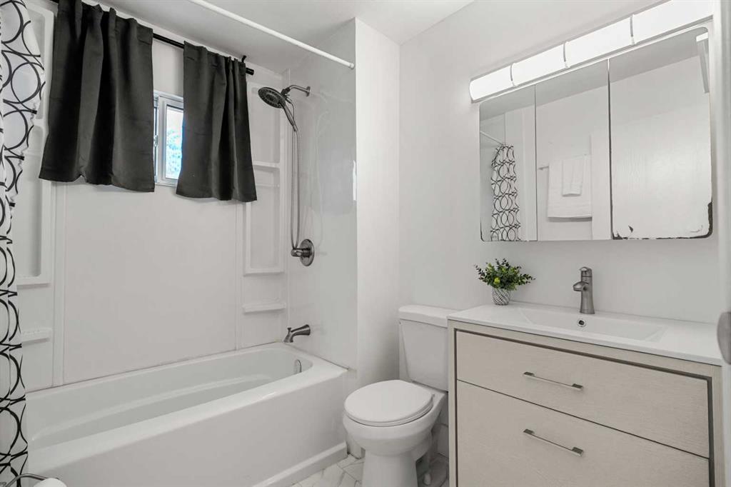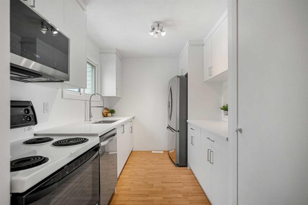 This updated 3-bedroom end-unit townhouse is ideally located on a quiet street and offers the convenience of a parking stall directly outside the front door, along with a fully fenced backyard that backs onto a community green space with access to a variety of neighbourhood amenities. The main floor boasts durable laminate flooring throughout and a newly renovated galley-style kitchen with bright white cabinetry, stone countertops, an undermount sink, pantry storage, and a convenient peek-a-boo opening to the dining area along with a well-placed west facing window bringing in plenty of natural light. The spacious dining room flows effortlessly into the living room, where large patio doors overlook the fenced yard and green space beyond. Upstairs, you will enjoy new carpet, a four piece bathroom, and three good sized bedrooms with closet organizers. The partially finished basement presents excellent potential for additional living space and only needs carpet and baseboards. It would be perfect for a family room, home gym, office, or kids’ play area. Recent updates include a renovated kitchen in 2025, a new washer and dryer in 2025, new carpet and lighting in 2025, a new fence in 2025, a new refrigerator in 2024, a new dishwasher in 2023, and a furnace cleaning in 2025. Families will appreciate being within walking distance of St. Thomas More School, Annie Foote School, and Guy Weadick School. The location also provides quick and easy access to Stoney Trail and public transit options. For recreation and community engagement, the nearby Temple Community Association offers seasonal activities, sports fields, playgrounds, and a large outdoor hockey rink and courts maintained by volunteers, making this a great setting for active lifestyles and neighbourhood gatherings.