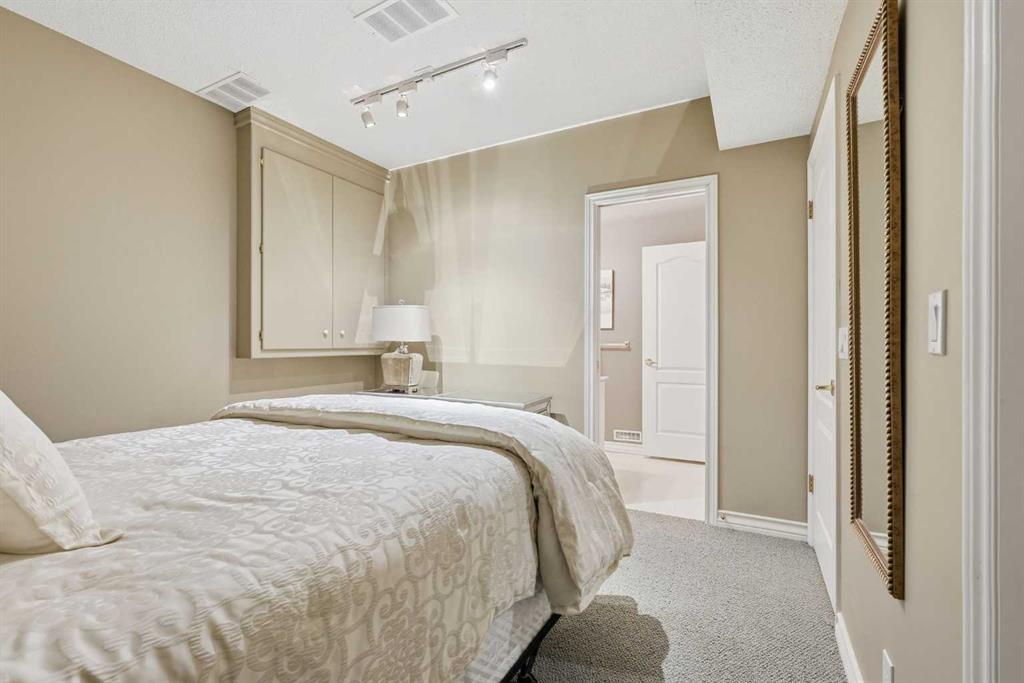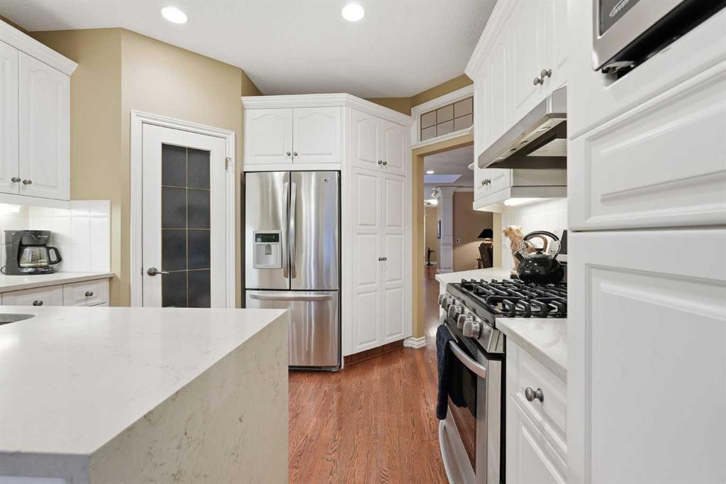Inviting, fastidiously maintained and exceptionally spacious villa bungalow with a FULLY DEVELOPED WALK OUT BASEMENT, set within the exclusive gated community of The Brickburn in Patterson. Offering nearly 3,400 sq ft of beautifully maintained living space, this residence blends timeless elegance with thoughtful updates. The main level features rich hardwood floors, refined crown mouldings, and stylish lighting. A generous living room anchored by a classic feature fireplace flows seamlessly into the formal dining area—an ideal setting for hosting family and friends. The tastefully updated and reconfigured kitchen is appointed with newer quartz countertops, abundant cabinetry including a pantry, newer stainless steel appliances, and a charming breakfast nook. The serene primary suite provides direct access to the south-facing deck and includes dual walk in closets along with a private 4 piece ensuite complete with double sinks and an oversized shower. A dedicated office with custom built ins is tucked just off the foyer, creating an ideal work from home retreat. A 2 piece powder room and well appointed laundry room with sink and storage complete the main level. The expansive walk out basement is designed for entertaining, offering a spacious family room with fireplace, a full wet bar, a large recreation area, a comfortable bedroom, a 4 piece bath, and exceptional storage. Additional highlights include built in speakers, all Poly B has been removed from the home and the AC will keep you cool in the hot summer months! A sunny south deck overlooking a tranquil greenspace, the convenience of a double attached garage, and the privacy and security of a beautifully maintained gated community. This lovely home is perfectly positioned near scenic Edworthy Park, shopping, schools, public transit, and provides effortless access to Bow Trail and Sarcee Trail.