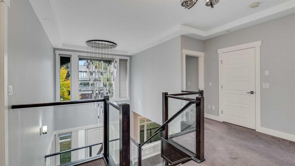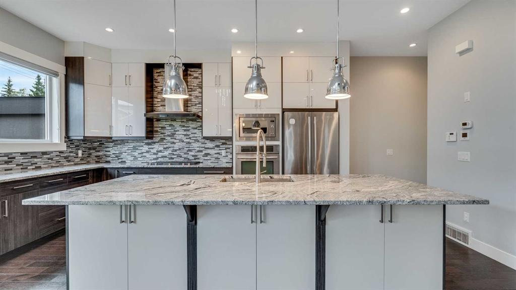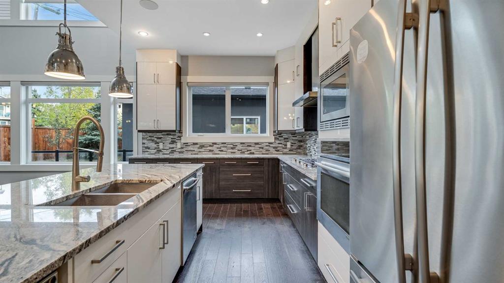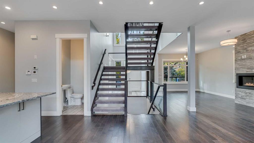 **Open House Oct’ 18 Sat 12-3pm, 19-Sun-1-4pm**Masterpiece of Modern Elegance in Parkdale Nestled just steps from the serene Bow River pathways and the lush beauty of Elbow Park, this exquisite residence offers the perfect balance of nature, luxury, and urban convenience. Ideally situated near the Alberta Children’s Hospital, Foothills Hospital, and Market Mall, every essential—whether shopping, recreation, or emergency care—is mere minutes away. Behind the property, tranquil walking and cycling trails invite you to unwind and reconnect with the outdoors. Set on a generous 45-foot lot in Calgary’s highly sought-after inner-city enclave of Parkdale, this stunning stucco home is a showcase of architectural sophistication and exceptional craftsmanship. Spanning over 4,000 sq.ft. of opulent living space, including 2,573sq.ft. above grade, it features five spacious bedrooms and four-and-a-half luxurious baths. From the moment you enter, the home’s grandeur is undeniable—beginning with a soaring 19-foot foyer, beautifully tiled floors, and a dramatic open-riser staircase that exudes modern artistry. Expansive windows flood the open-concept interior with natural light, highlighting fine finishes and elegant design details throughout. The main living area is anchored by a sleek gas fireplace, offering both warmth and sophistication—a perfect setting for relaxed evenings or formal gatherings. The chef-inspired kitchen is a true statement of luxury, boasting a large granite island with breakfast bar, two-tone custom cabinetry, a built-in wine cooler, and an elite JennAir appliance package. French doors lead seamlessly to an oversized patio, ideal for al fresco dining and entertaining, complete with a rough-in BBQ gas line and integrated sound system. A spacious main-floor office or flex room, along with a refined powder room, completes this impressive level. The upper floor unveils a private master retreat that redefines comfort and elegance. Featuring a west-facing balcony, a romantic two-sided fireplace, and a spa-worthy ensuite with a freestanding soaker tub, glass-enclosed shower, and bespoke walk-in closet, this suite is designed for pure relaxation. Two additional bedrooms—one with its own ensuite—plus a stylish full bath provide exceptional accommodation for family or guests. The fully developed lower level extends the home’s luxurious living with a vast recreation and media area, two additional bedrooms, and a full bath. A remarkable highlight is the legal basement suite with in-floor heating and a private entrance, offering both comfort and versatility—ideal for extended family, guests, or potential rental income. Additional features include a central vacuum system, built-in audio throughout all three levels, and advanced exterior security cameras for peace of mind. Every element of this residence has been thoughtfully curated to offer a lifestyle of refined elegance, comfort, and modern sophistication—all within one of Calgary’s most desirable riverside communities.