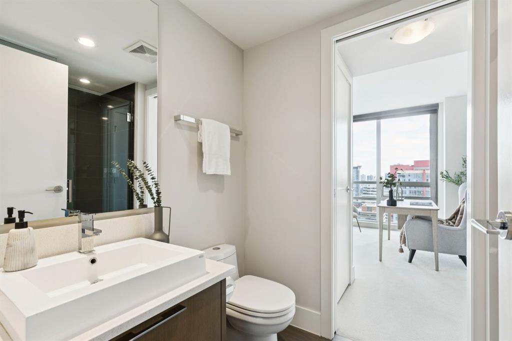 Experience elevated urban living in this stylish LUNA residence, where panoramic views stretch from the dazzling downtown skyline across North Hill, the Bow River valley, C.O.P., and out to the Rocky Mountains. Designed with one of the most sought after layouts, this bright and modern 2 bed/2 bath suite places the bedrooms on opposite sides for optimal privacy, with an open concept kitchen, living, and dining area at its heart. Flooded with natural light from floor-to-ceiling windows, the home exudes warmth while maintaining a sleek, contemporary aesthetic. The well equipped kitchen showcases warm wood cabinetry, black quartz counters, a glass backsplash, and premium stainless steel appliances including Fisher & Paykel refrigerator, gas cooktop, and oven, and a Blomberg dishwasher. A spacious island with seating flows seamlessly into the dining area, which opens onto a glass-railed balcony that’s perfect for soaking in breathtaking panoramic views. The primary retreat offers a custom walk-through closet leading to a luxurious 5pc ensuite featuring in-floor heating, a deep soaker tub, and a separate shower. The second bedroom is equally well appointed with dual closets and convenient access to a 3pc cheater ensuite. Thoughtful touches like custom blackout blinds, air conditioning, in-suite laundry, and additional in-suite storage ensure everyday comfort and convenience. Residents of LUNA enjoy an exceptional array of amenities including a fully equipped gym, yoga studio, steam spa, party room, guest suites, concierge service, visitor parking, and a serene outdoor zen garden with fireplace. Located in the heart of the vibrant Beltline, you’re just steps from shopping, dining, the Bow River pathways, and everyday essentials. Complete with a storage locker (Level 3 #316) and underground parking (P1 #L28) this home offers the perfect blend of luxury, functionality, and unbeatable inner-city lifestyle.
