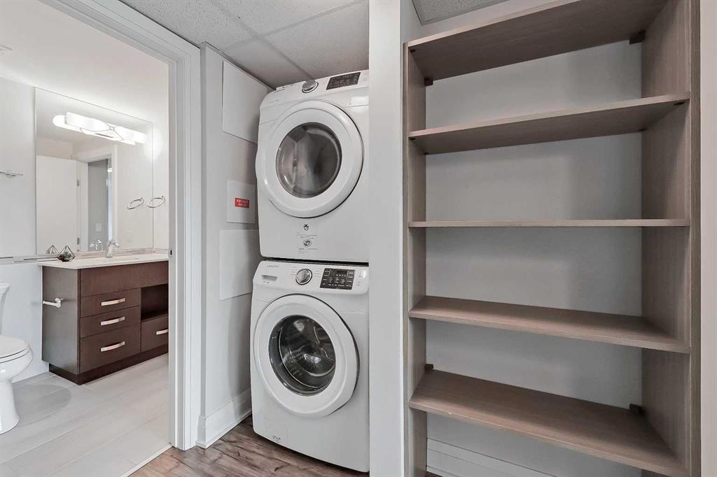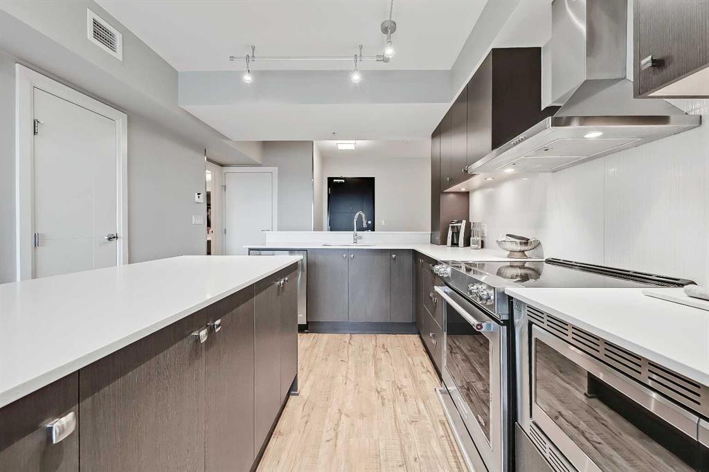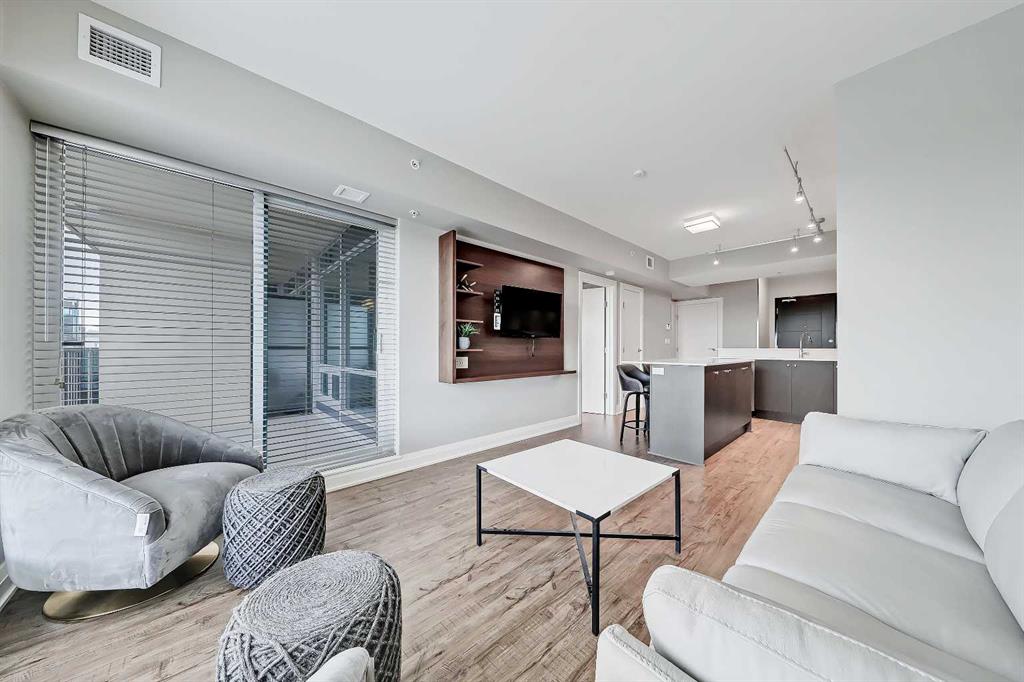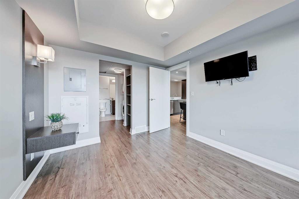 *VISIT MULTIMEDIA LINK FOR FULL DETAILS, INCLUDING IMMERSIVE 3D TOUR & FLOORPLANS!* This bright NORTH-facing 1-bed + den unit with stunning PANORAMIC RIVER VIEWS from the 23rd floor in the upscale Vogue building is a must-see! There are only 4 upgraded floors in the Vogue building, which were specially customized for Bedouin Suites, and this is one of them! EXCLUSIVE BEDOUIN FEATURES include upgraded hallways and common areas, as well as INCREDIBLE UNIT UPGRADES like custom kitchen islands with bar seating, upgraded appliances & lighting including dimmers throughout, custom bedroom panelling including built-in side tables with convenience plugs, upgraded bathrooms with tile wainscoting and glass shower doors, built-in walnut entertainment units, a Smart Sensor energy management system for the eco-minded buyer and MORE! This customized ‘VARSITY’ floorplan also had a kitchen wall removed for improved flow and natural light, and WOW, does it look good! This condo presents modern living at its finest, including an open-concept layout filled with natural light through ample floor-to-ceiling windows, complemented by luxury vinyl plank flooring adorning the main living spaces. The modern kitchen boasts wood-grain cabinets with modern hardware and under-cabinet lighting, a specially designed central island with quartz counters, a tile backsplash, a dual-basin undermount sink, and upgraded stainless steel appliances, including a chimney-style hood fan. The open main living area features a built-in walnut entertainment unit with a wall-mount TV included and access to a large balcony with a gas line for a BBQ and panoramic views of the Bow River. The bedroom features custom wall panelling with built-in side tables, wall sconce lighting and a convenient receptacle with a USB port, plus an included wall-mounted TV. A large walkthrough closet with built-in organizers and a stacked laundry leads to the 4-pc bathroom complete with occupancy-sensored lights, quartz countertops, tile wainscoting, an undermount sink with modern faucet, tile backsplash, modern vanity with storage, tile floors, and a large tub/shower combo with full height tile and an upgraded glass door. Complete with a sizeable den, a perfect home office or flex space, a titled indoor parking stall in the heated parkade and a storage locker. VOGUE is a high-end building with a ton of amenities, including central A/C, an elegant formal lobby, full-time concierge, gym, billiards, a large party room with a kitchen, a yoga studio, a Sky Lounge on the 36th floor, and multiple rooftop terraces. Surrounded by parks, transit, the LRT, shopping & more, & within walking distance to the downtown core & all Kensington shops & services – this location offers the best urban lifestyle in the Downtown Commercial Core. *Please note, the photos are from the same unit, one floor up.
